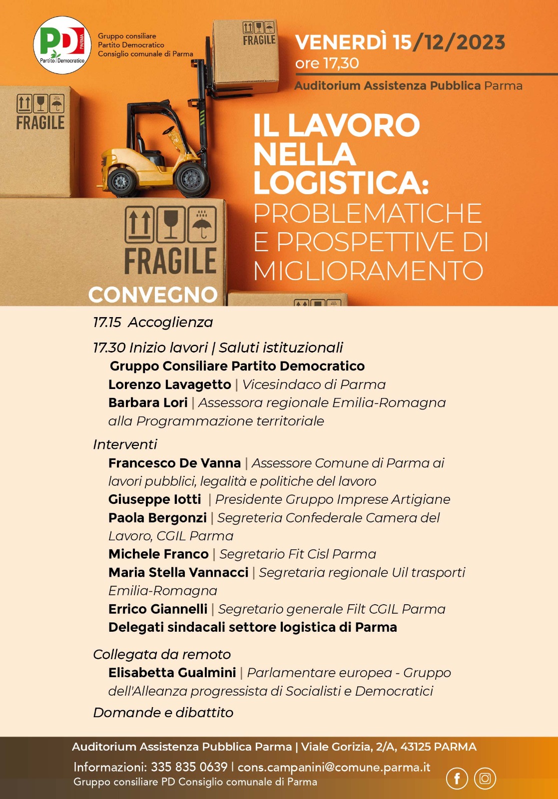 Venerdì 15 dicembre 2023, a Parma, con inizio alle ore 17.30, e accoglienza dalle 17.15, presso l’Auditorium dell’Assistenza Pubblica in via Gorizia, 2/A, il Gruppo Consiliare del Partito Democratico organizza il convegno “Il Lavoro nella Logistica”, un’importante occasione aperta a tutti per trattare e approfondire i tanti temi legati alle problematiche e alle prospettive di miglioramento di questo settore.