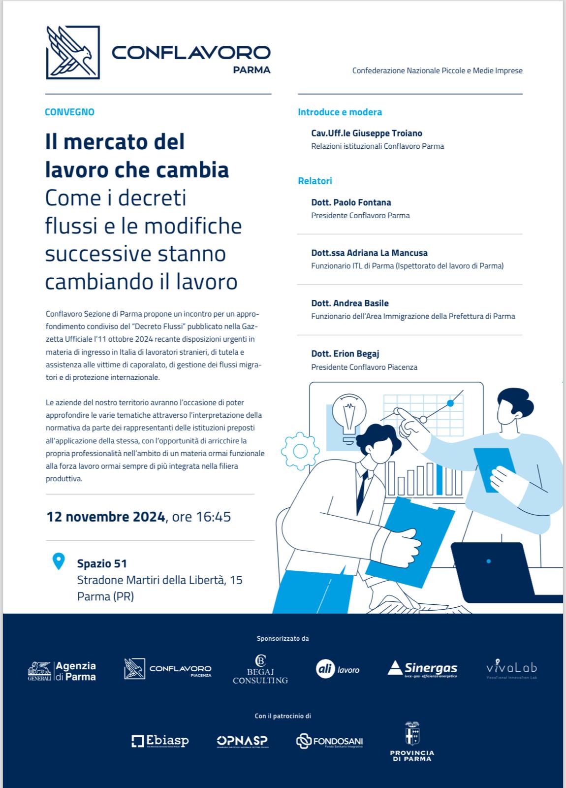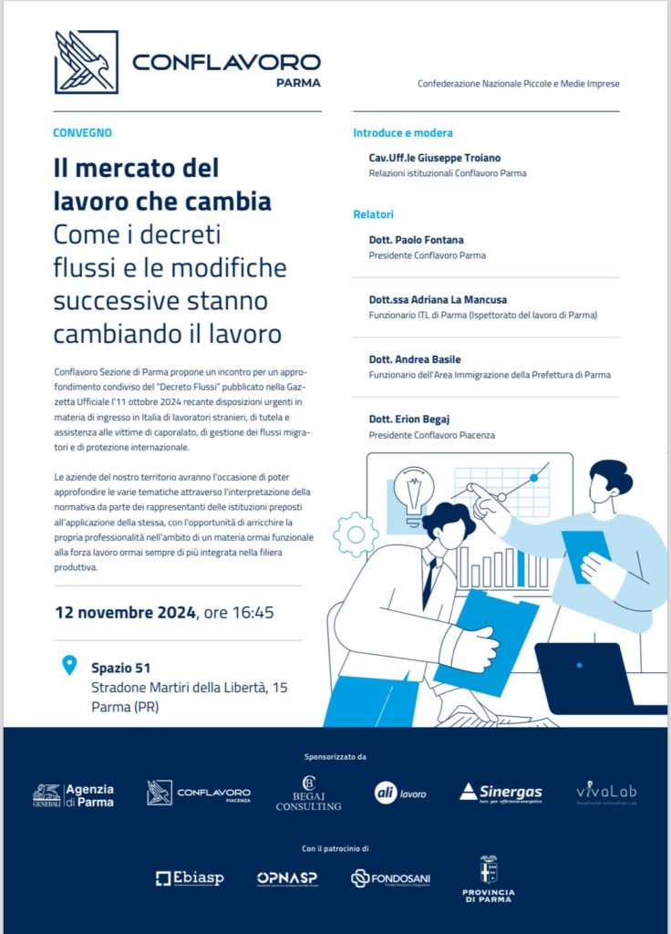 CONFLAVORO PMI Parma, in collaborazione con la sede Conflavoro Piacenza, organizza il convegno sul tema “Il mercato del lavoro che cambia” – Decreto Flussi 2025.