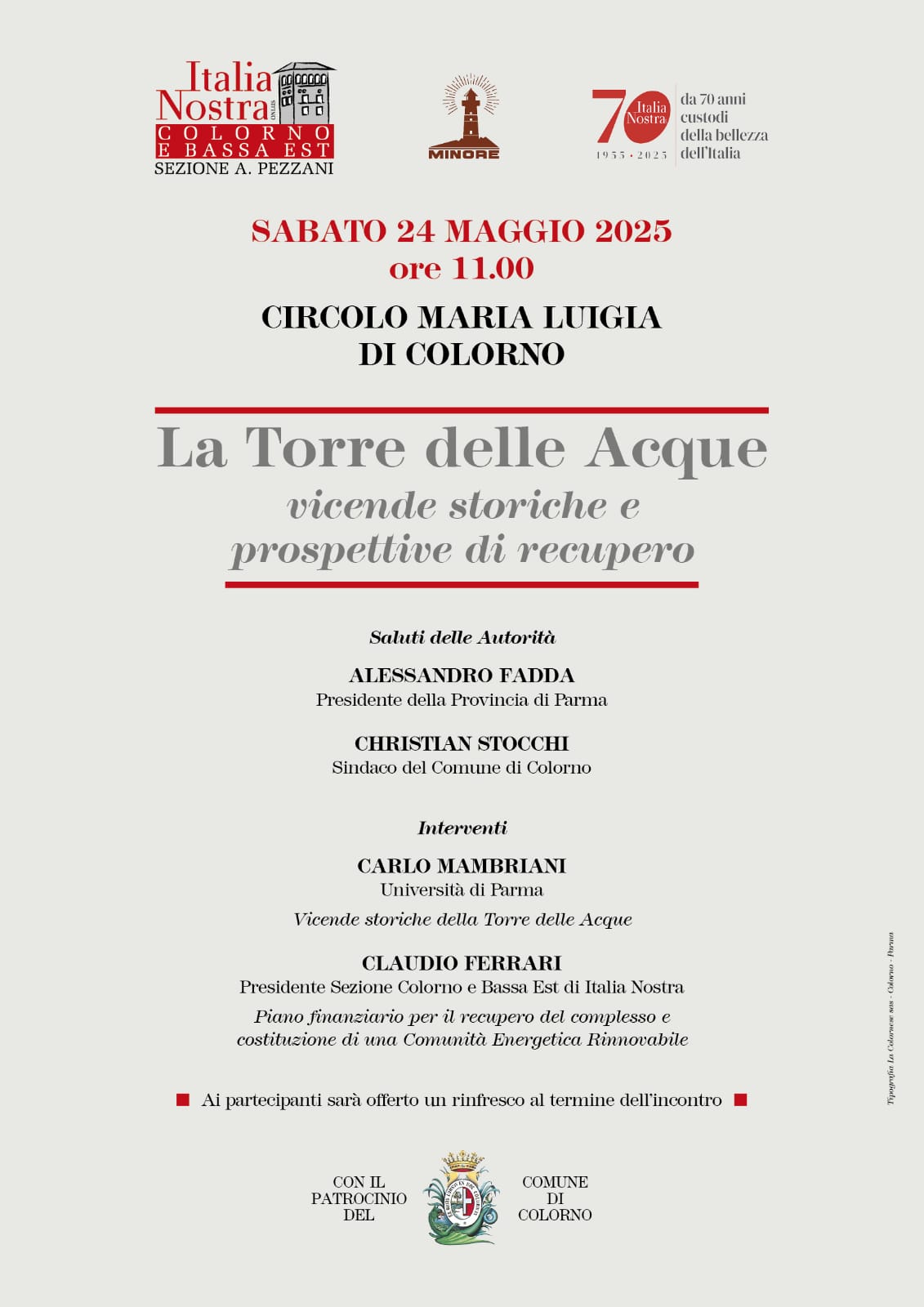 I saluti iniziali sono stati affidati ad Alessandro Fadda, Presidente della Provincia di Parma (oltre che Sindaco di Torrile) e Christian Stocchi, Sindaco di Colorno.