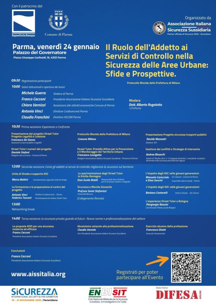 L’evento in programma venerdì 24 gennaio presso il Palazzo del Governatore di Parma, organizzato dall’Associazione Italiana Sicurezza Sussidiaria (AISS) l’associazione che per prima in Italia nel 2017 avviò il primo progetto pilota con il Comune di Pordenone che prevedeva l’utilizzo degli Addetti ai Servizi di Controllo.
