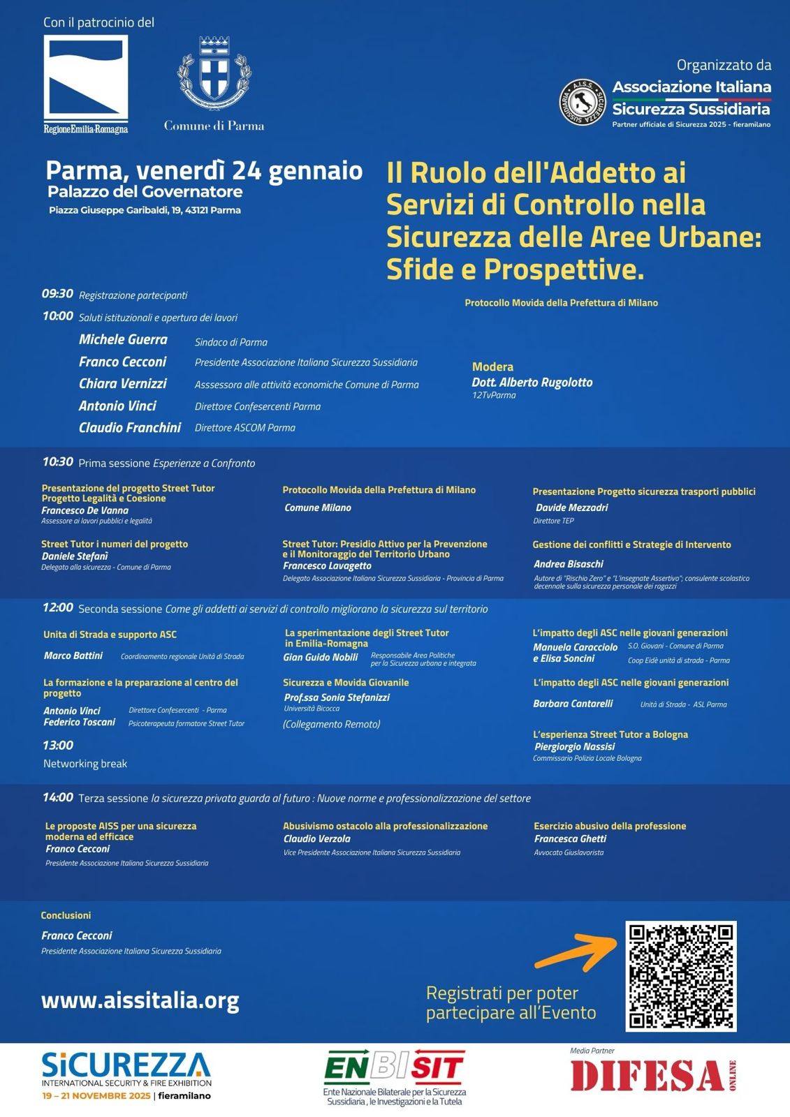 L’evento in programma venerdì 24 gennaio presso il Palazzo del Governatore di Parma, organizzato dall’Associazione Italiana Sicurezza Sussidiaria (AISS) l’associazione che per prima in Italia nel 2017 avviò il primo progetto pilota con il Comune di Pordenone che prevedeva l’utilizzo degli Addetti ai Servizi di Controllo.