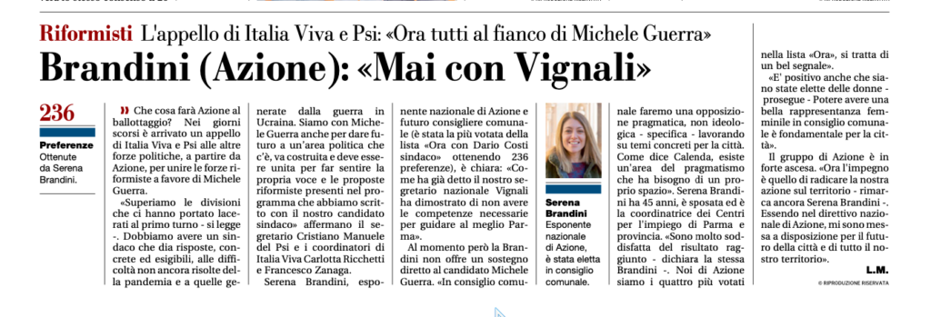 Dopo le dichiarazioni di Carlo Calenda (leader nazionale di Azione) (leggi), di Federica Ubaldi di Civiltà Parmigiana (leggi) e di Serena Brandini (capolista Azione) che hanno dichiarato il loro netto “no a Vignali”, arriva un altro comunicato dalla coalizione di Dario Costi.