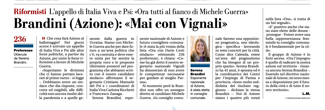 Dopo le dichiarazioni di Carlo Calenda (leader nazionale di Azione) (leggi), di Federica Ubaldi di Civiltà Parmigiana (leggi) e di Serena Brandini (capolista Azione) che hanno dichiarato il loro netto “no a Vignali”, arriva un altro comunicato dalla coalizione di Dario Costi.