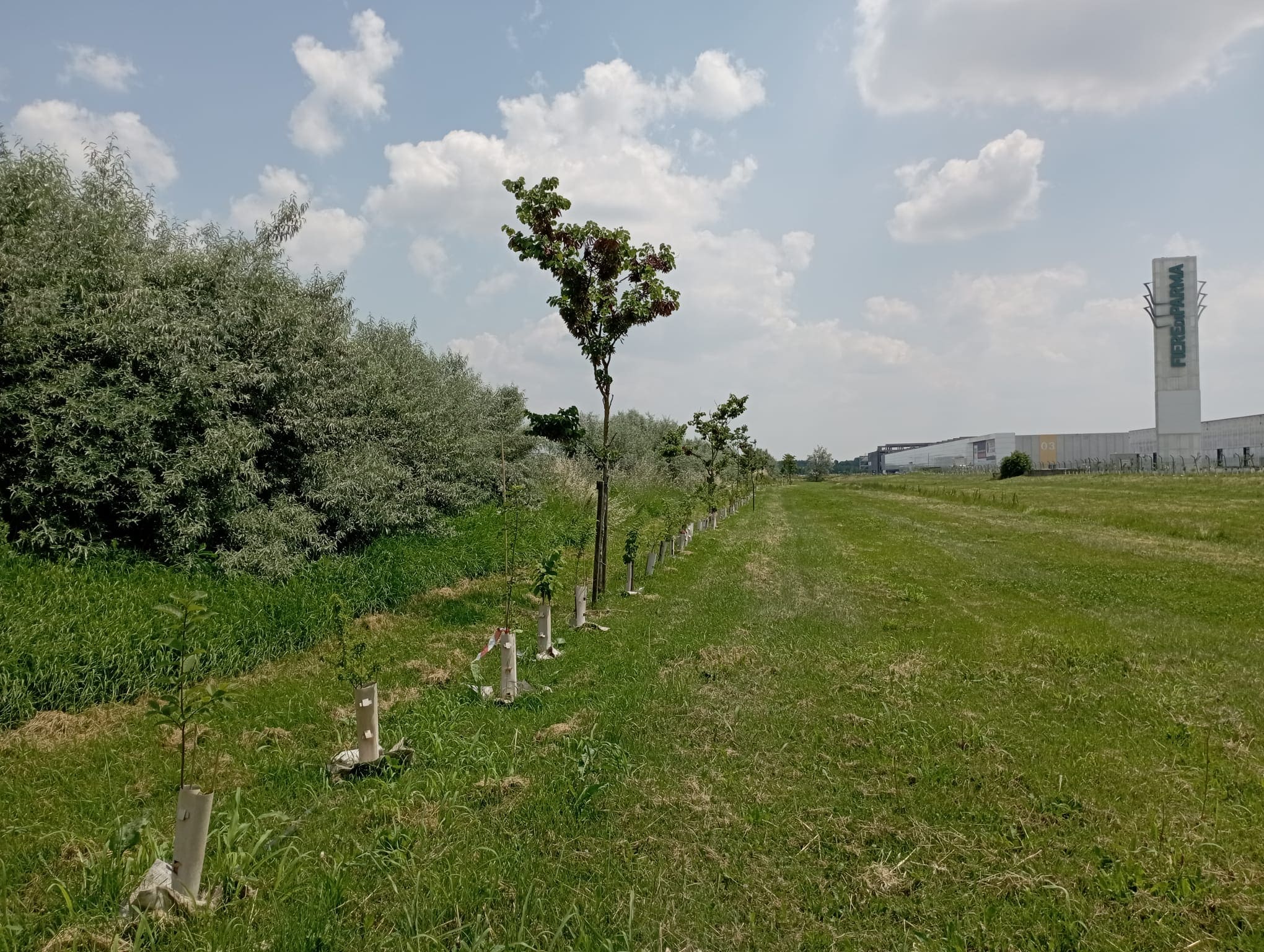 La creazione di un’infrastruttura verde, con alberi e arbusti che costeggiano l’autostrada, era un obiettivo dichiarato di Fiere di Parma già da diversi anni, quando la vicina azienda Davines Spa, aveva proposto la realizzazione di una schermatura naturale per mitigare l’inquinamento atmosferico e acustico, donando alla città un biglietto da visita verde da presentare idealmente a tutti i viaggiatori che ogni giorno transitano lungo il tratto parmigiano della A1. Dopo aver vinto il bando regionale “Mettiamo radici per il futuro”, nato con l’obiettivo di mettere a dimora 4,5 milioni di nuovi alberi entro il 2030 (uno per ogni abitante della Regione), le Fiere di Parma hanno ottenuto un finanziamento pari al 60% del totale dei costi ammessi per l’intervento di forestazione dell’area, che ha visto così la messa a dimora di 750 piante tra alberi e arbusti.