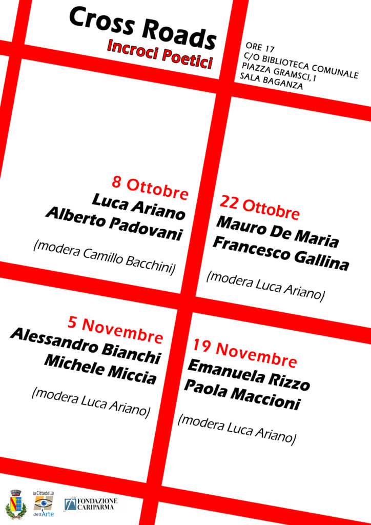 “Crossroad”, ovvero versi che si incrociano e artisti che si raccontano in quattro incontri da non perdere, che si svolgeranno sempre il sabato alle ore 17 nella Biblioteca comunale “Vilma Preti” all’interno della suggestiva Rocca Sanvitale di Sala Baganza. Quattro incontri con otto poeti del parmense, organizzati e promossi dall’Amministrazione comunale, che rientrano nel progetto “La Cittadella dell’Arte”, realizzato grazie al contributo di Fondazione Cariparma.