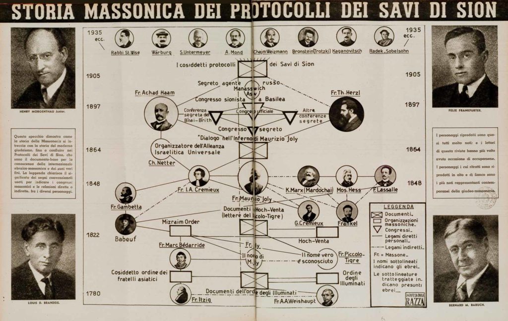 L’opera comparve per la prima volta nel 1903 nella Russia zarista per giustificare la persecuzione degli ebrei. In seguito alla Rivoluzione d’Ottobre, l’idea che il bolscevismo fosse una cospirazione ebraica per il dominio mondiale diventò uno degli strumenti più utilizzati dalla propaganda fascista in Italia e nazista in Germania, e in questo clima i Protocolli diventarono il testo di riferimento per procedere allo sterminio degli ebrei.