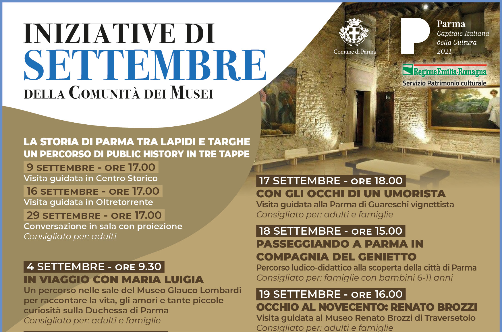 Un nuovo punto di vista e di visita si può avere invece con «La storia di Parma tra lapidi e targhe», un percorso di public history in tre tappe: 9 settembre alle ore 17:00, visita guidata in centro storico; 16 settembre alle 17:00 visita guidata in Oltretorrente; infine 29 settembre, sempre alle 17:00, ultima tappa con una conversazione in sala con proiezione.