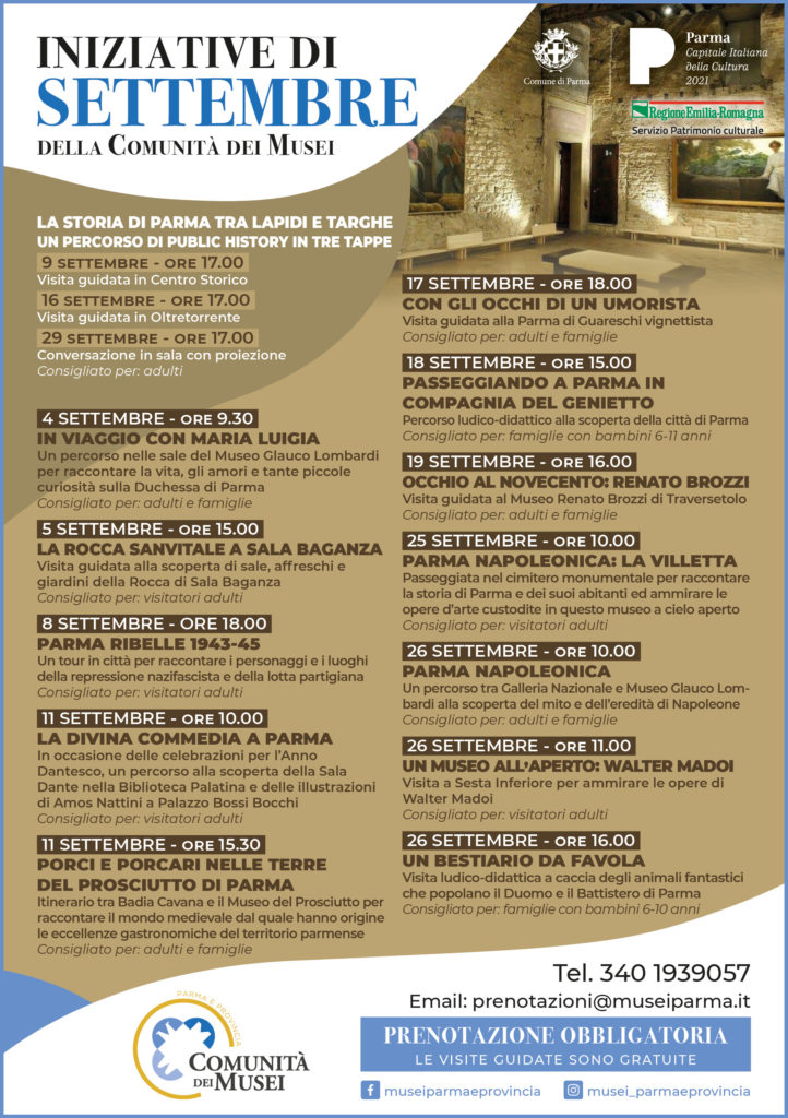 Mercoledì 8 settembre alle 18:00 avrà invece luogo «Parma ribelle 1943-45», un tour in città per raccontare i personaggi e i luoghi della lotta partigiana e delle repressioni nazifasciste.