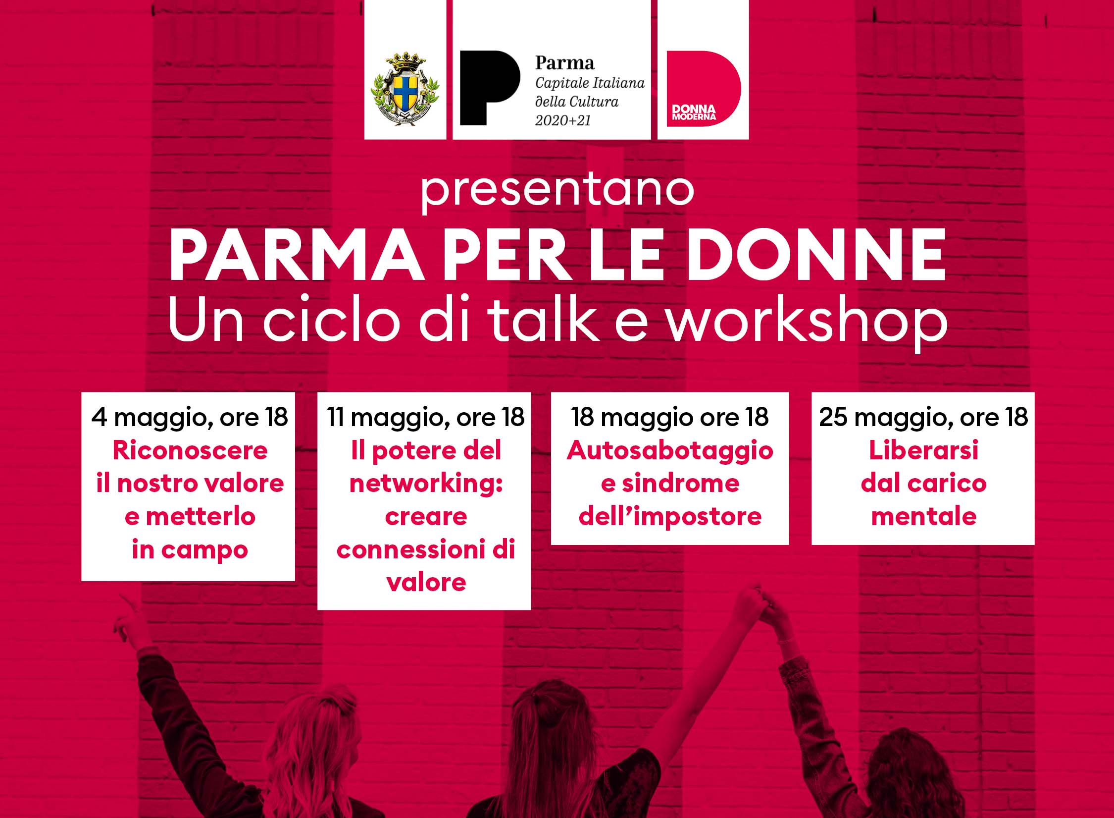 Si aprirà martedì prossimo la proposta dell’Assessorato alle Pari Opportunità “PARMA PER LE DONNE“. Dal 4 Maggio sempre di martedì un poker di imperdibili poker di appuntamenti settimanali on line, a partire dalle 18, firmati in collaborazione con Donna Moderna. Il ciclo dedicato all’empowerment femminile si svolge in collaborazione con la rivista Donna Moderna, brand leader nel segmento femminile di riferimento, attivo nelle campagne di promozione del ruolo delle donne nella vita sociale ed in particolare in quelle contro la violenza sulle donne.