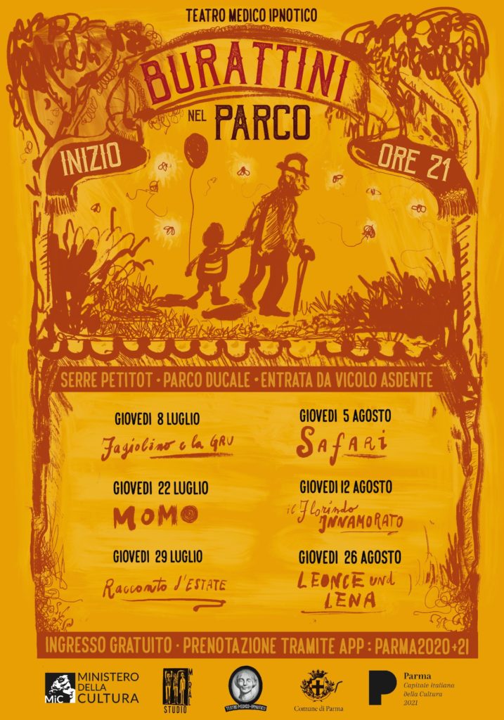 Prende il via giovedì 8 luglio, alle ore 21 alle Serre Petitot del Parco Ducale, la rassegna di spettacoli di burattini a cura della compagnia Teatro medico ipnotico, organizzata dal Comune di Parma, nell’ambito dell’avviso pubblico Parma Estate 2021, con il sostegno del MIC – Ministero della Cultura.
