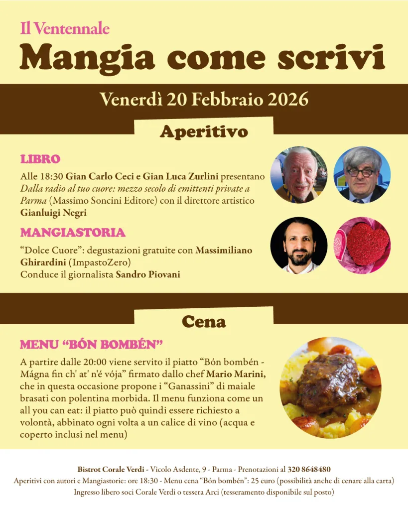 Il secondo appuntamento dell’anno di Mangia come scrivi, che dallo scorso novembre sta celebrando il proprio ventennale, si terrà venerdì 20 febbraio al Bistrot Corale Verdi di Parma, e sarà caratterizzato da un’anteprima assoluta: la presentazione del libro “Dalla Radio al tuo cuore – Mezzo secolo di emittenti private a Parma” (Massimo Soncini Editore), curato dai giornalisti Gian Carlo Ceci e Gian Luca Zurlini, in uscita il giorno successivo, distribuito in edicola dalla Gazzetta di Parma a 14 euro più il prezzo del quotidiano.