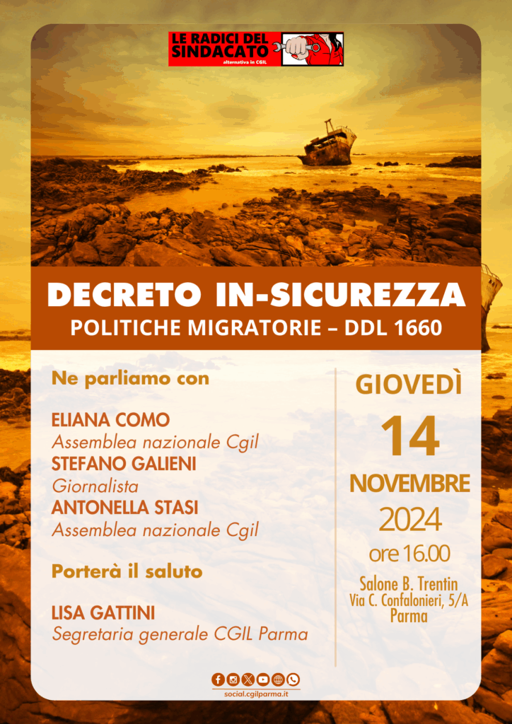 Se ne parlerà il prossimo giovedì 14 novembre alle ore 16, nel salone Trentin della Camera del Lavoro di Parma, in un incontro dal titolo “DECRETO IN-SICUREZZA. Politiche migratorie ddl 1660”, promosso da “Le radici del sindacato – Alternativa in CGIL”. Interverranno ELIANA COMO, Assemblea nazionale Cgil, STEFANO GALIENI, giornalista, e ANTONELLA STASI, Assemblea nazionale Cgil. Porterà un saluto LISA GATTINI, Segretaria generale CGIL Parma.