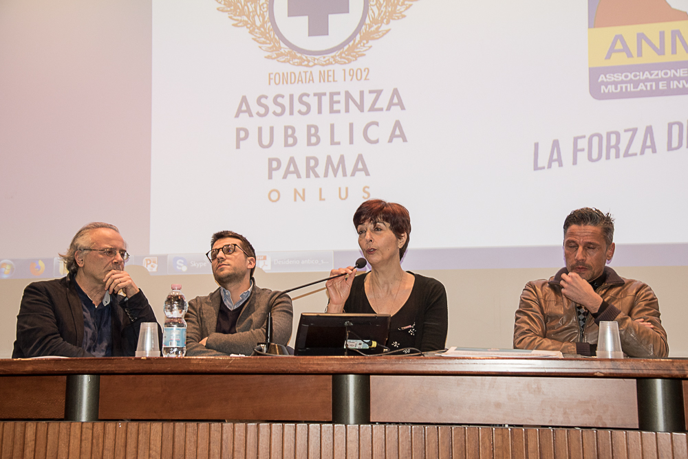 Dopo i saluti di Luca Bellingeri, presidente di Assistenza Pubblica Parma Onlus, e di Alberto Mutti, presidente di Anmic Parma, sono intervenuti Emma Tassi-Carboni, moglie di Giorgio, Aberto Rugolotto, regista del docufilm, Alessandro Nidi, autore delle musiche originali, Luca Quintavalli, amministratore di Olmedo Spa e Aricar Spa, e il sindaco di Parma, Federico Pizzarotti, che ha voluto chiudere l’incontro a nome di tutta la città.