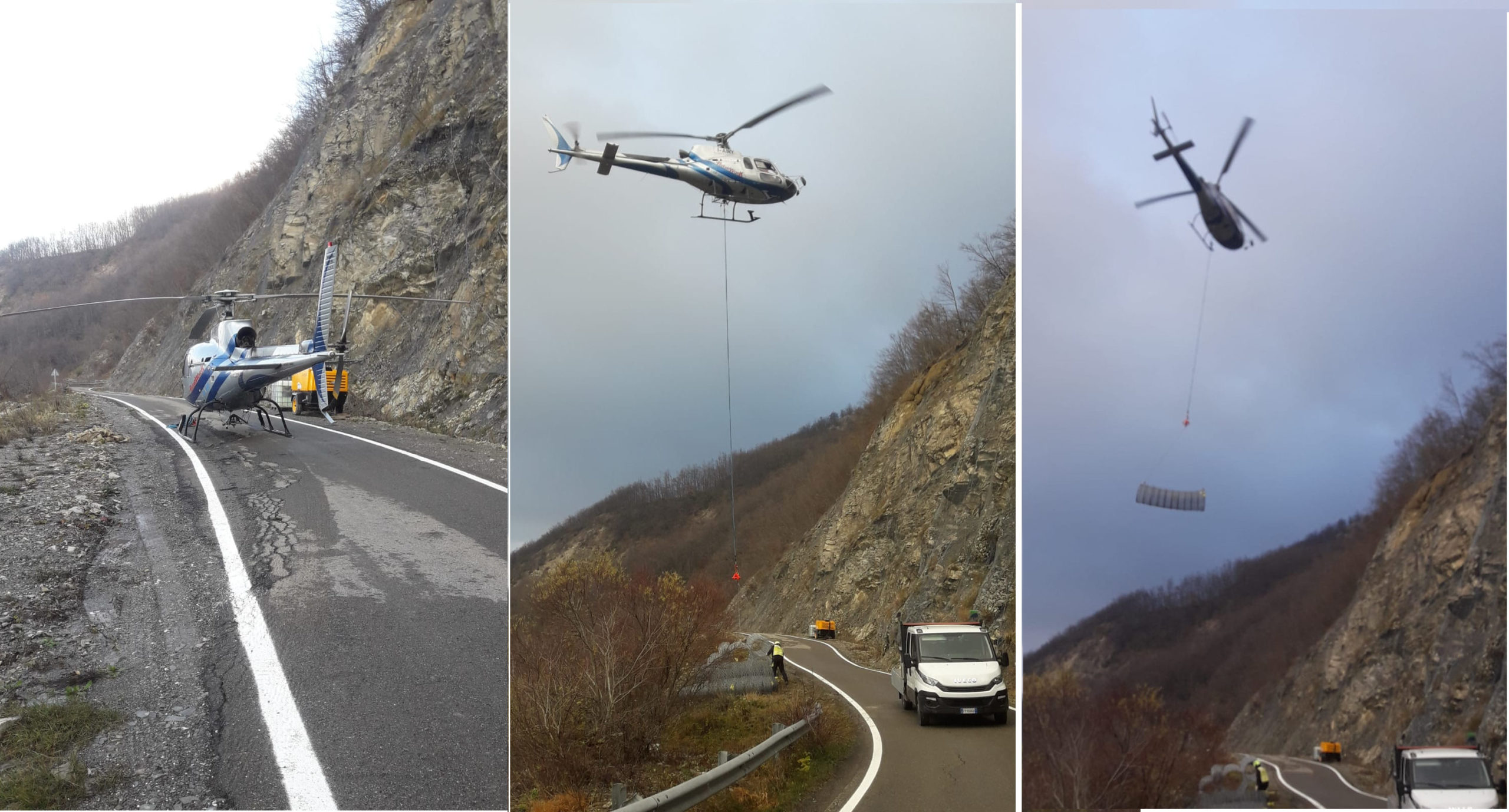 Per il trasporto dei pannelli alla sommità della frana è stato necessario utilizzare un elicottero.
