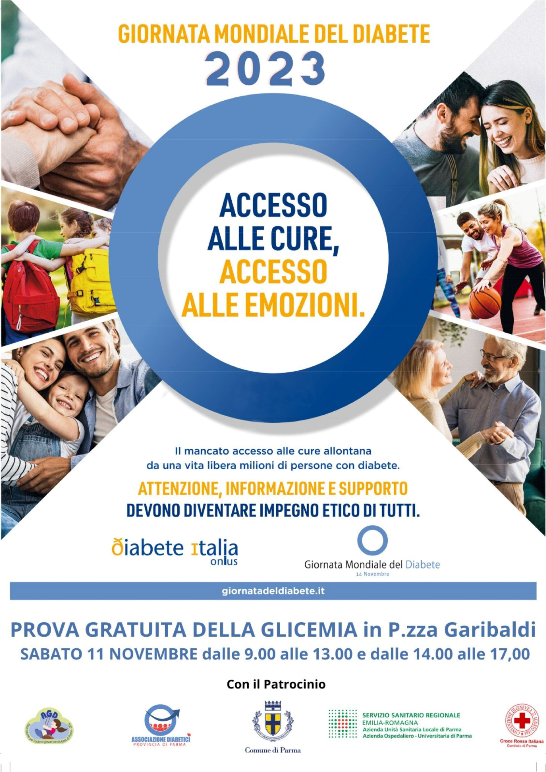 Il primo appuntamento è per sabato 11 novembre in piazza Garibaldi a Parma dove, dalle 9 alle 13 e dalle 14 alle 17, i volontari delle due associazioni offrono ai cittadini lo screening gratuito della glicemia, mentre i medici diabetologi con gli infermieri delle Aziende sanitarie effettuano una valutazione del rischio diabete. Scopo della giornata è anche informare sulla malattia nelle sue forme e sui corretti stili di vita per prevenirla e gestirla al meglio. In particolare, i volontari di AGD Parma odv puntano a sensibilizzare sui sintomi del diabete di tipo 1 per evitare la chetoacidosi diabetica al momento dell’esordio.