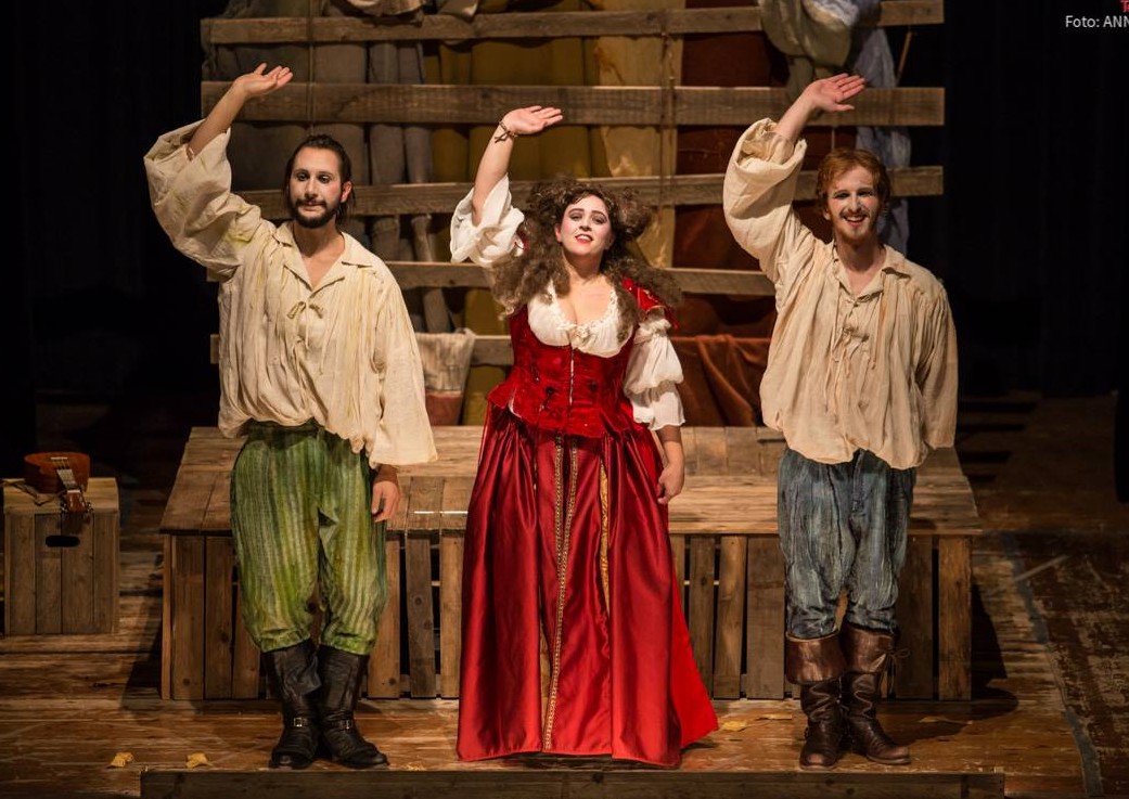 Corre l’anno 1574 e per le calli di Venezia circola una notizia: Enrico III di Valois, diretto a Parigi per essere incoronato Re di Francia, passerà una notte nella Serenissima. Giulio Pasquati e Girolamo Salimbeni, coppia di ciarlatani saltimbanco dai trascorsi burrascosi, vengono incaricati di dare spettacolo in onore del principe. Mica una storia qualunque, certo che no, la più grande storia d’amore che sia mai stata scritta: Romeo e Giulietta. Questo è il punto di partenza dell’esilarante spettacolo ROMEO E GIULIETTA – L’amore è saltimbanco, della compagnia vicentina Stivalaccio Teatro, in scena al Teatro Comunale di Fontanellato sabato 14 aprile alle ore 21.00. I due saltimbanchi avranno solo due ore di tempo per prepararsi ad andare in scena, provare lo spettacolo e, soprattutto, trovare la “Giulietta” giusta, casta e pura, da far ammirare al principe Enrico. Ed ecco comparire nel campiello la procace Veronica Franco, poetessa e “honorata cortigiana” della Repubblica, disposta a cimentarsi nell’improbabile parte dell’illibata giovinetta. I tre attori Anna De Franceschi, Michele Mori e Marco Zoppello danno vita ad una “prova aperta”, alla maniera degli artigiani delSogno di una notte di mezza estate, dove la celeberrima storia del Bardo prende forma e si deforma nel mescolarsi di trame, di dialetti, canti, improvvisazioni, suoni, duelli e pantomime.