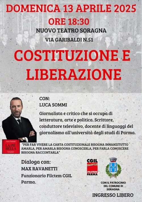 Costituzione e Liberazione: domenica 13 aprile, a Soragna, Luca Sommi, giornalista e critico, conoscitore di arte, letteratura e politica, conduttore televisivo e docente di linguaggi del giornalismo all’Università di Parma, dialogherà con Max Ravanetti, funzionario sindacale della FILCTEM CGIL territoriale, su come far vivere nella nostra vita la Carta costituzionale, conoscendola, raccontandola, amandola.