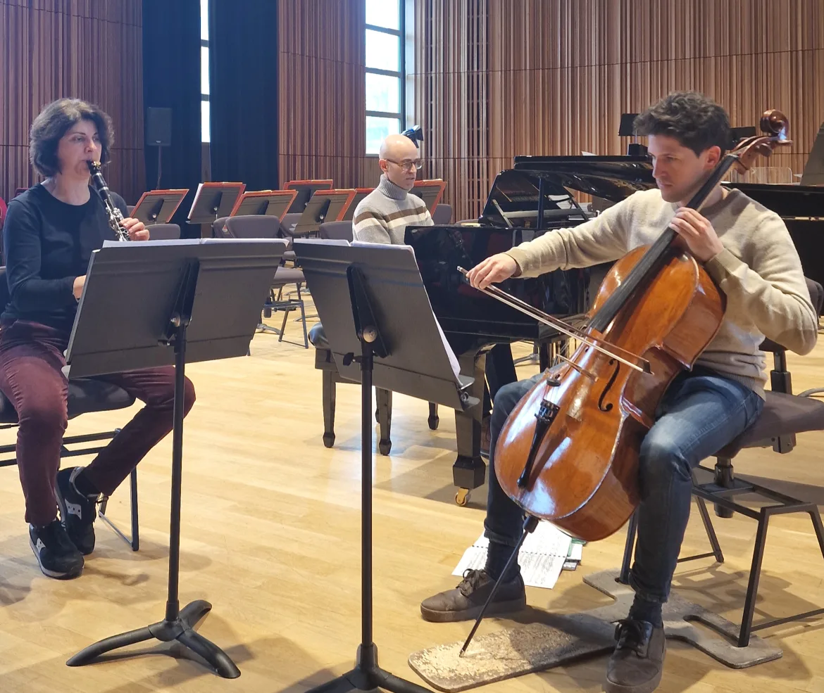 Protagonisti della matinée saranno Miriam Caldarini al clarinetto, Martino Maina al violoncello e Davide Carmarino al pianoforte, impegnati in un programma che mette in dialogo il Trio in si bemolle maggiore op. 11 di Beethoven e il Trio in la minore op. 114 di Brahms, due opere simbolo della scrittura cameristica tra eleganza formale e profondità espressiva.