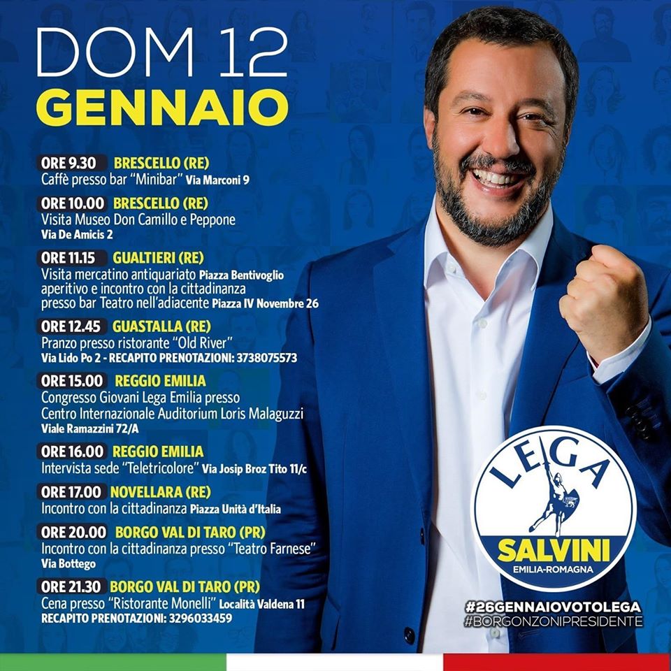 Domenica e lunedì Salvini sarà ancora in provincia di Parma: Borgotaro, Medesano, Noceto, Varano Melagari, Parma, Salsomaggiore di UG 11 Gennaio 2020 11 Gennaio 2020 18 Matteo Salvini continua a battere la nostra provincia in questa campagna elettorale: domenica sera 12 gennaio e lunedì 13 gennaio sarà a Borgotaro e poi a Medesano e Noceto, a Varano Melegari, a Parma e a Salsomaggiore.