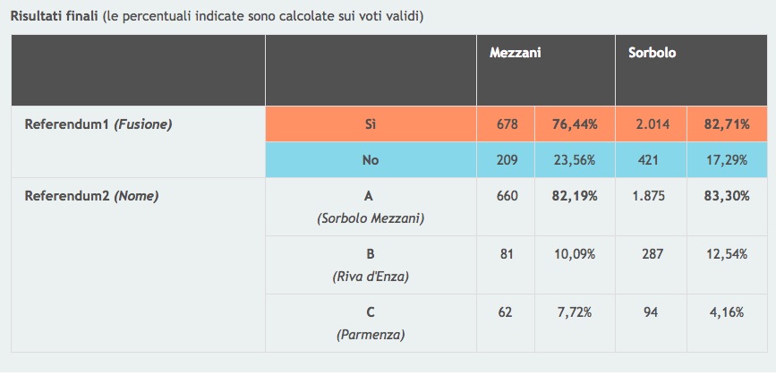 Vittoria del Sì sia a Sorbolo (82%) che a Mezzani (76%): la fusione passa.