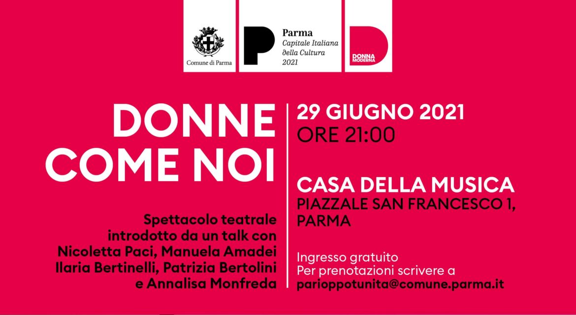 Martedì 29 giugno 2021 ore 21, nel cortile della Casa della Musica di Parma, si terrà lo spettacolo teatrale “Donne come noi” tratto dall’omonimo libro scritto dalle giornaliste di Donna Moderna Giulia Minoli ed Emanuela Giordano.