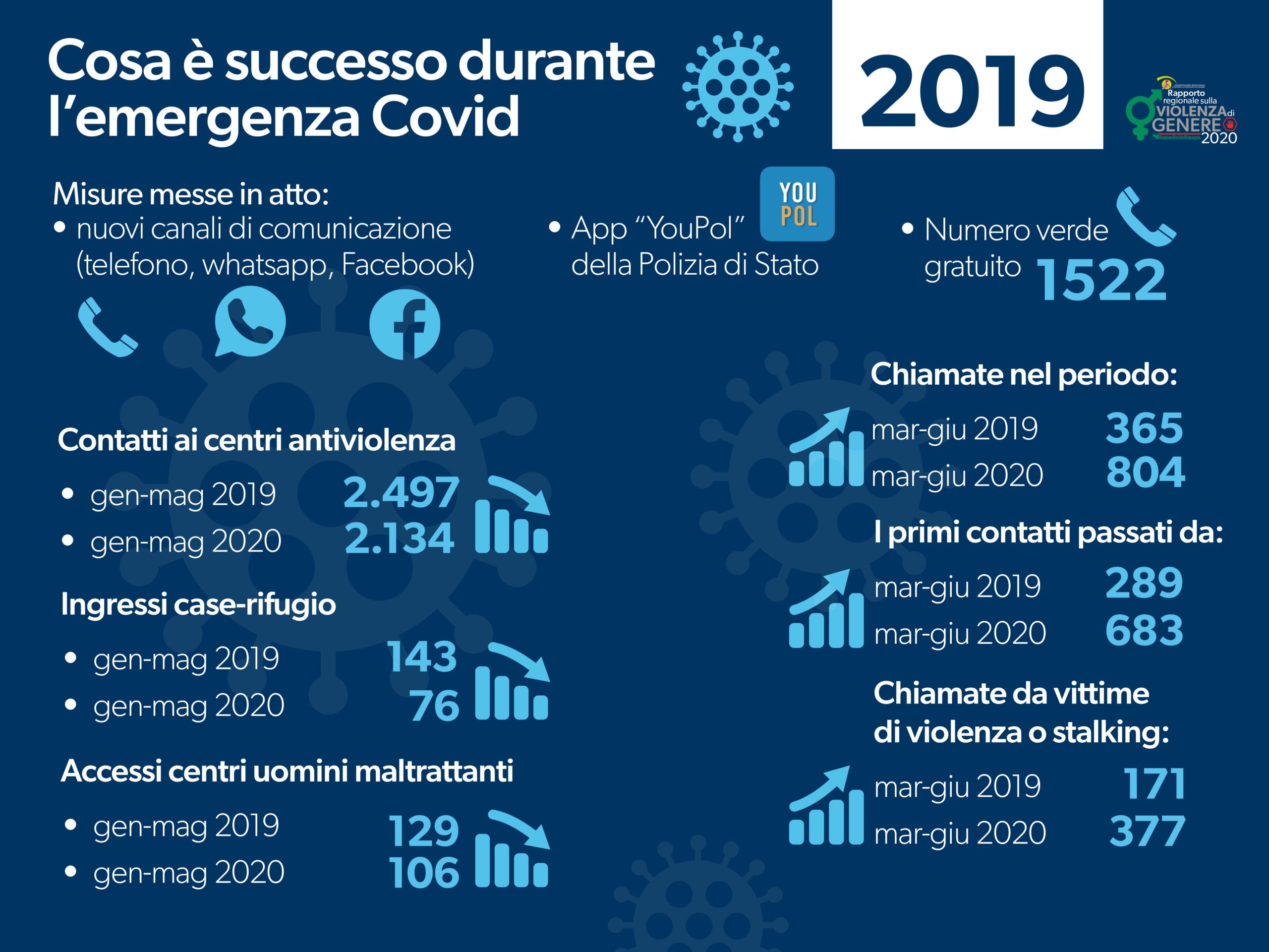 Nei primi 5 mesi del 2020, le donne che si sono rivolte a un Centro antiviolenza sono state 2.134 contro le 2.497 del 2019. Dimezzati in particolare i contatti avuti nel mese di marzo rispetto allo stesso mese dell’anno precedente – da 340 nel 2019 a 184 nel 2020 – e gli ingressi nelle Case rifugio tra gennaio e maggio: da 143 nel 2019 a 76 nel 2020. In calo anche il numero degli accessi, sempre tra gennaio e maggio, ai Centri dedicati al trattamento degli uomini maltrattanti: da 129 a 106.