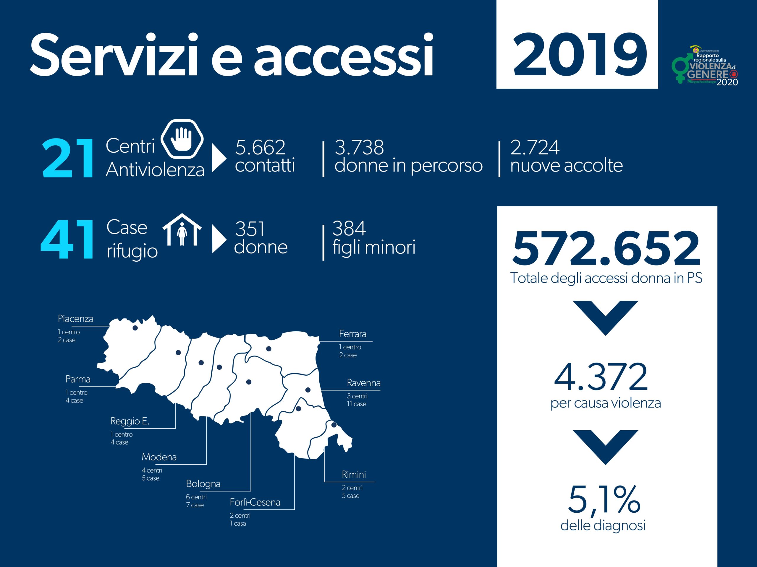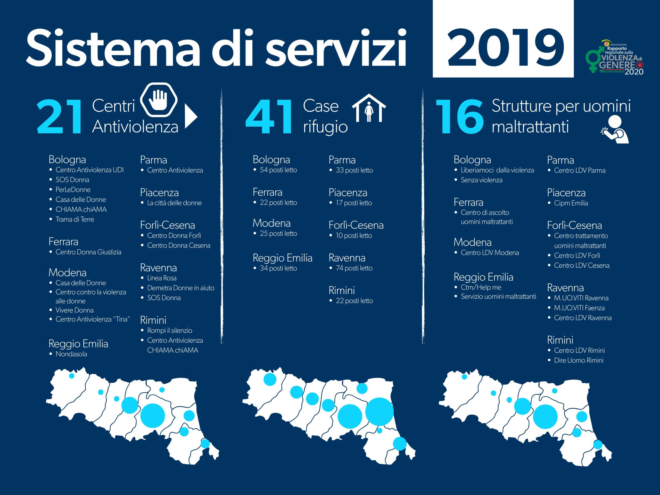 In Emilia-Romagna sono operativi 21 Centri antiviolenza, 41 Case rifugio e 16 Centri per uomini maltrattanti, di cui 7 pubblici e 9 del privato sociale.