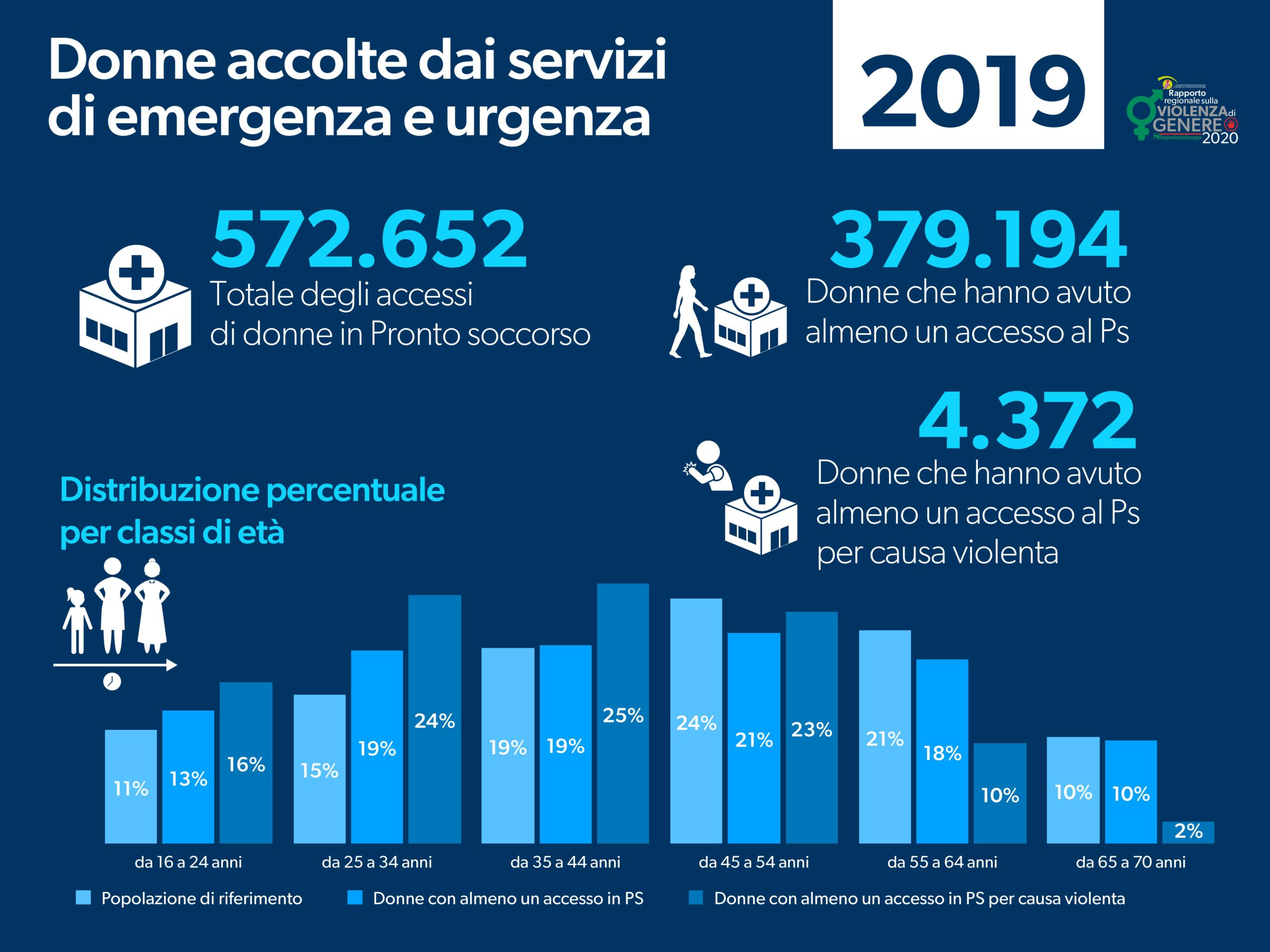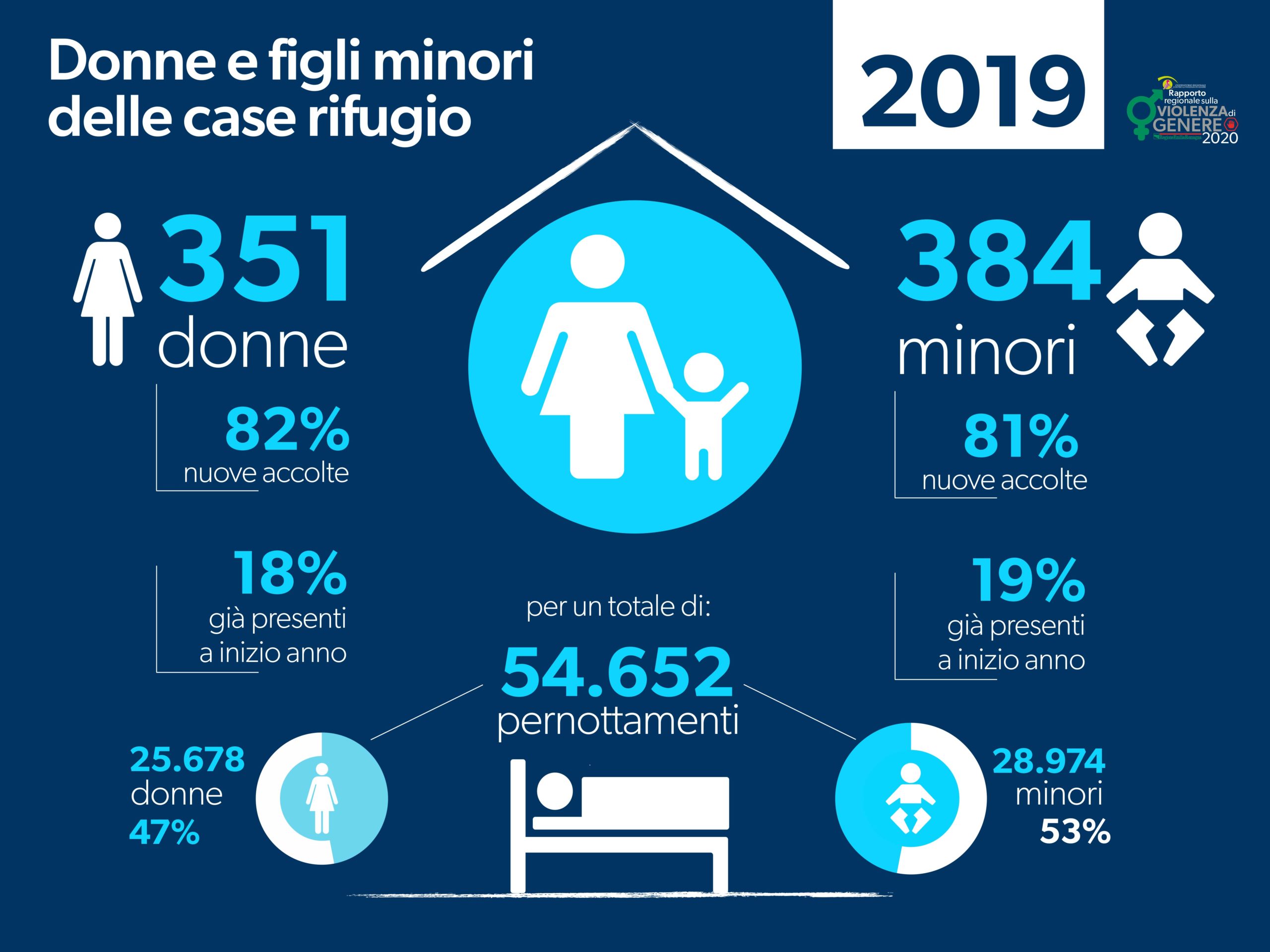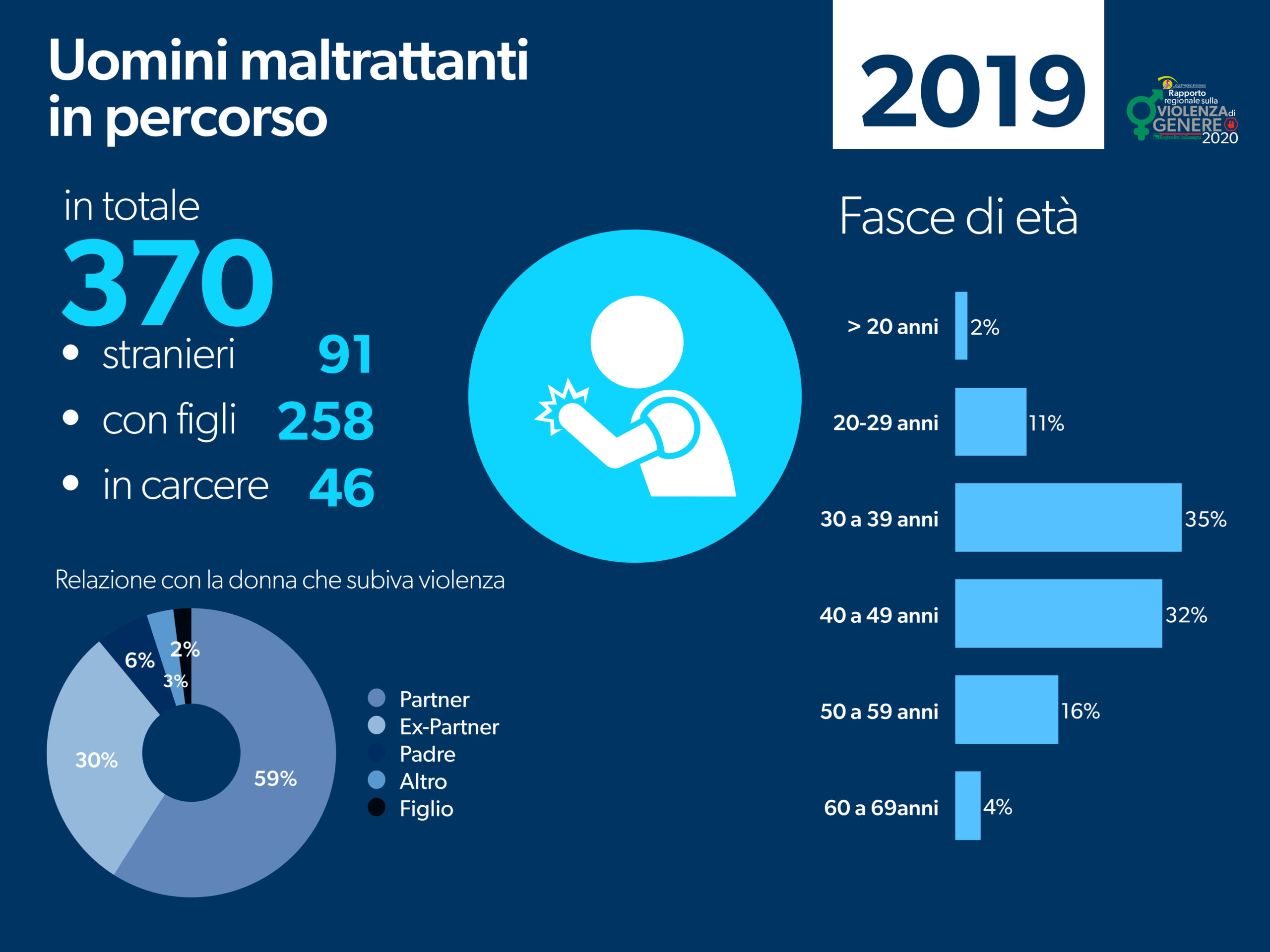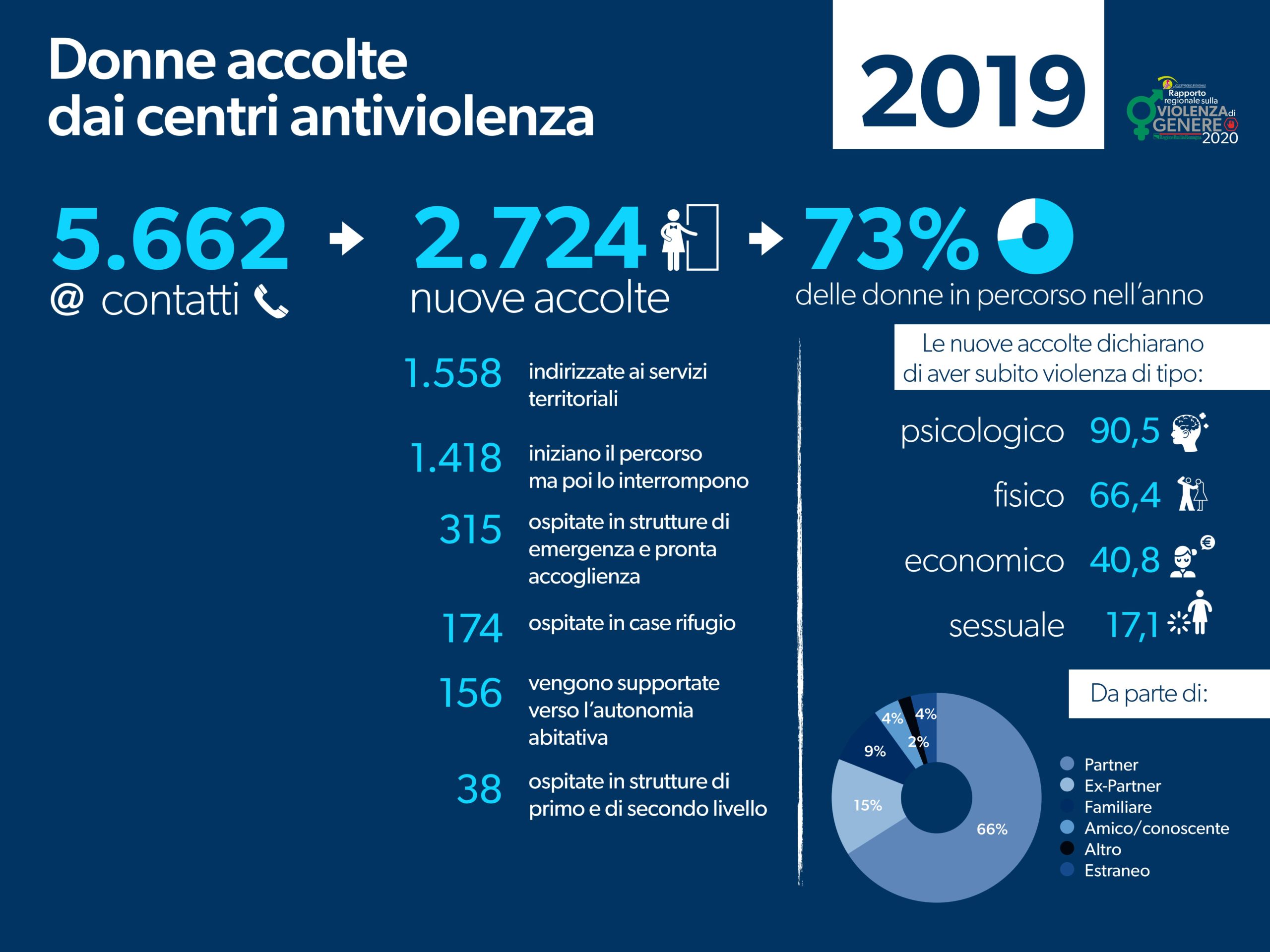 Nel 2019 le donne che hanno contattato un centro antiviolenza per ricevere attività di sostegno e di consulenza sono state 5.662 (nel 2018 erano state 4.871).Per quanto riguarda le Case rifugio – strutture a indirizzo segreto o riservato, che forniscono gratuitamente un alloggio sicuro a donne vittime di violenza, con o senza figli – nel 2019 i pernottamenti totali sono stati 54.652 contro i 41.903 dell’anno precedente. Infine nel 2019 sono stati 370 gli uomini in percorso presso un Centro per uomini maltrattanti. Erano 249 nel 2018.