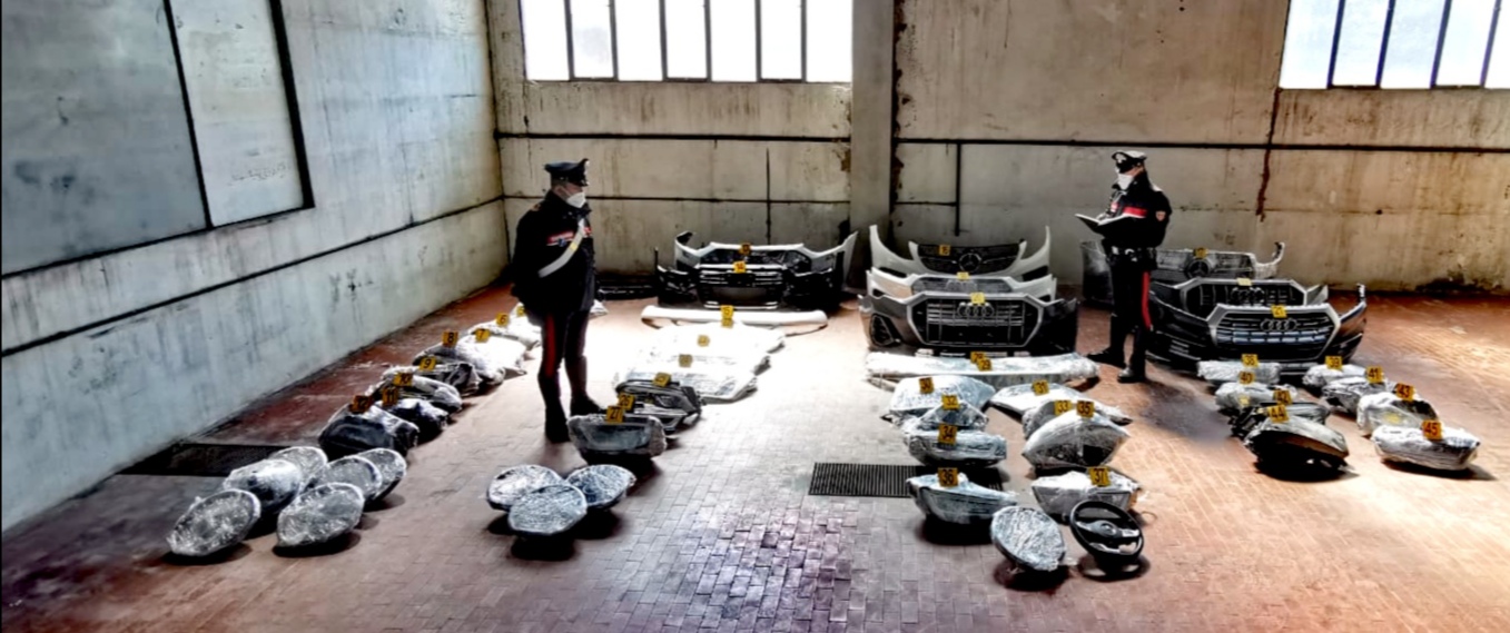 Poiché, erano prossimi ad allontanarsi e nell’impossibilità di aspettare i rinforzi, i militari hanno rotto gli indugi e si sono avvicinati velocemente. I delinquenti, vistisi scoperti, sono balzati di nuovo in macchina e sono partiti a tutta velocità, sfrecciando in direzione dell’autostrada facendo perdere le loro tracce. Sul posto è rimasto il furgone che una volta aperto è stato trovato carico di pezzi di ricambio di autovetture, di marche prestigiose, presumibilmente rubate in tutta la provincia e stipate all’inverosimile all’interno pronti per lasciare l’Italia. Una volta svuotato si è inventariato un totale di oltre 100 pezzi per autovetture Audi, Mercedes, BMW. In particolare: targhe rubate, kit airbag, gruppi ottici, navigatori, volanti, carene anteriori e posteriori, sottoscocche e paraurti per un valore complessivo di 150.000 €.
