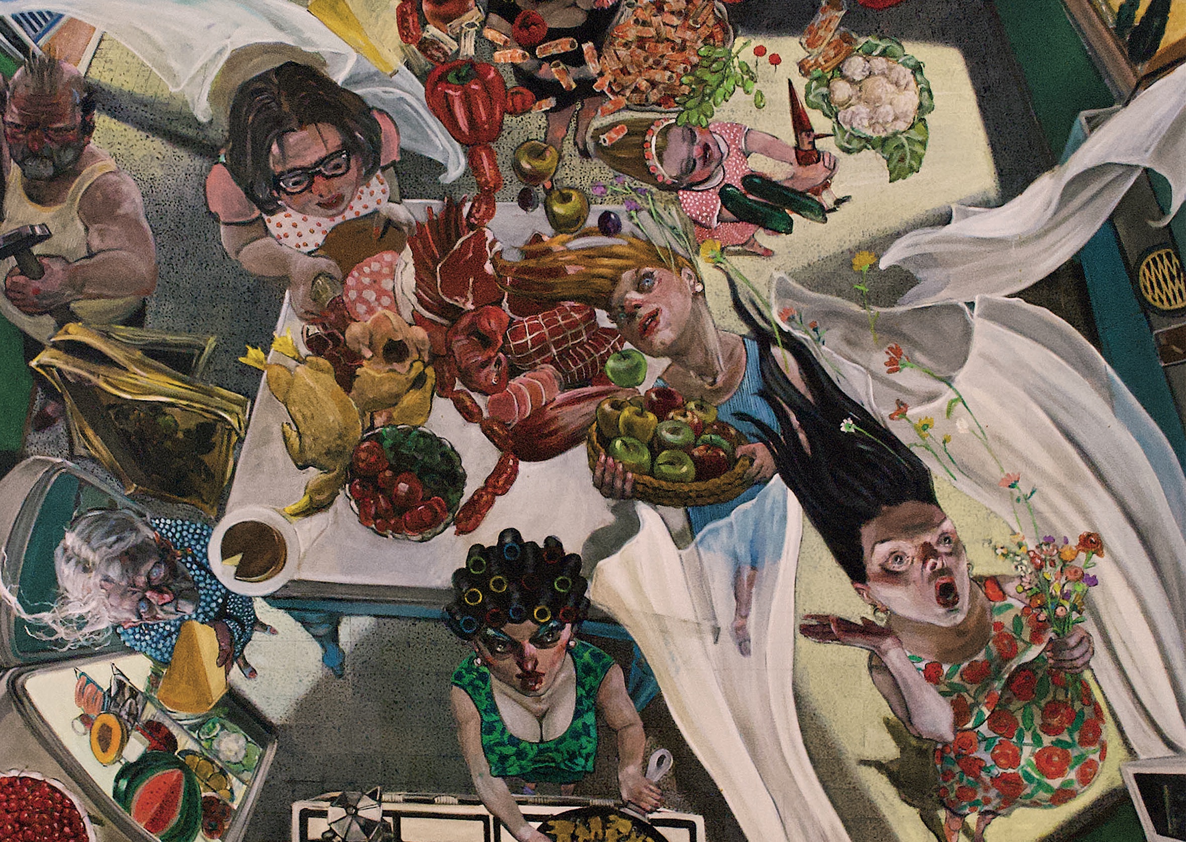 Il suo “Made in Italy” (olio su tela, 200×200 cm, 2019) mette in scena un’Italia gastronomica, femminile e solare, animata da un vento foriero di novità positive, aperta al futuro ma non immemore del nostro migliore passato (è citata la Città Ideale di Urbino e aleggia il tema dell’Annunciazione). Tutto questo in assoluta controtendenza rispetto a un’arte contemporanea massicciamente orientata a rappresentare, del presente, gli aspetti relativi al declino, alla sterilità, alla fatiscenza.