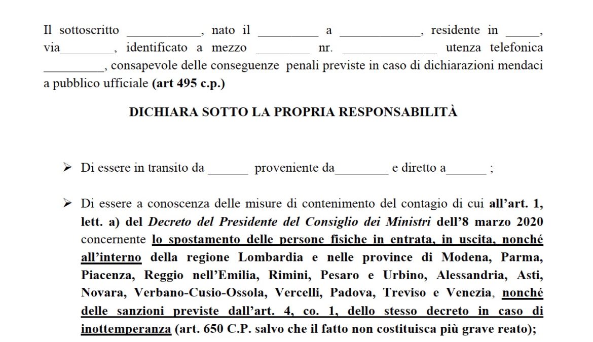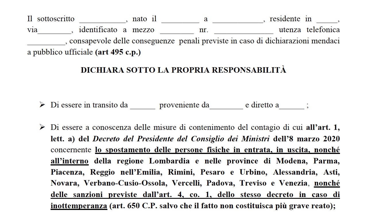 Nel modulo, che potrà essere consegnato e firmato dalle forze dell’ordine, bisogna specificare i motivi del viaggio, da dove si proviene e dove si va, di essere a conoscenza “delle misure di contenimento del contagio di cui all’art. 1, lett. a) del Decreto del Presidente del Consiglio dei Ministri dell’8 marzo 2020 concernente lo spostamento delle persone fisiche in entrata, in uscita, nonché all’interno della regione Lombardia e nelle province di Modena, Parma, Piacenza, Reggio nell’Emilia, Rimini, Pesaro e Urbino, Alessandria, Asti, Novara, Verbano-Cusio-Ossola, Vercelli, Padova, Treviso e Venezia, nonché delle sanzioni previste dall’art. 4, co. 1, dello stesso decreto in caso di inottemperanza (art. 650 C.P. salvo che il fatto non costituisca più grave reato).