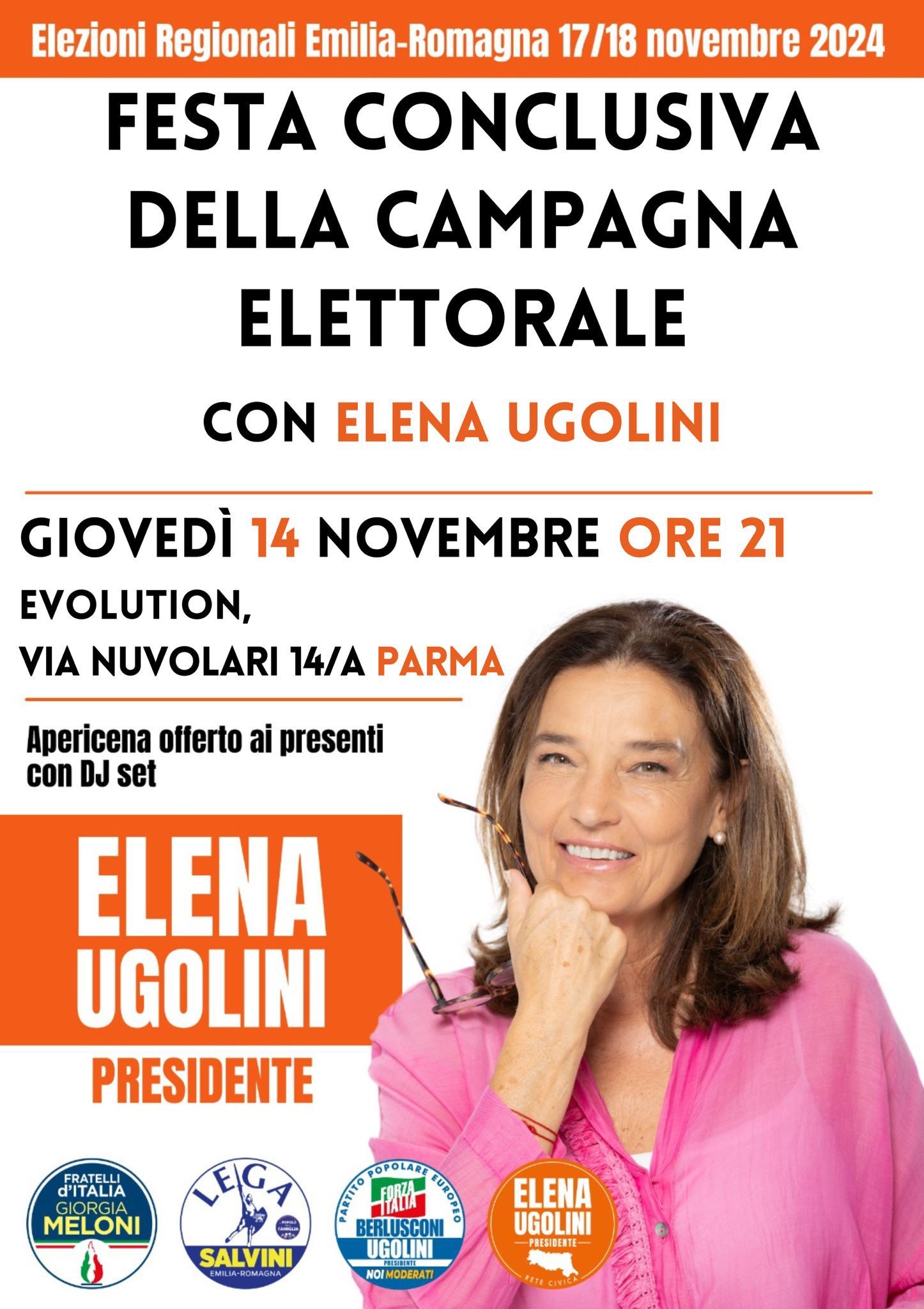 Questa sera Elena Ugolini svolgerà a Parma il suo ultimo evento nella città ducale. Alle ore 21:00, in via Tazio Nuvolari 14, nel locale Evolution, Elena Ugolini insieme ai partiti del centrodestra che l’hanno appoggiata, quindi Fratelli d’Italia, Lega e Forza Italia, terrà l’ultimo appello al voto prima del 17 e 18 novembre.