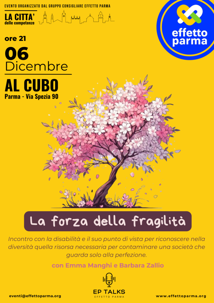 Mercoledì 6 dicembre presso la sala del CUBO di Via Spezia 90, si svolgerà il quarto ed ultimo appuntamento della rassegna EP TALKS – LA CITTA’ DELLE COMPETENZE” organizzata dal Gruppo Consiliare Effetto Parma.