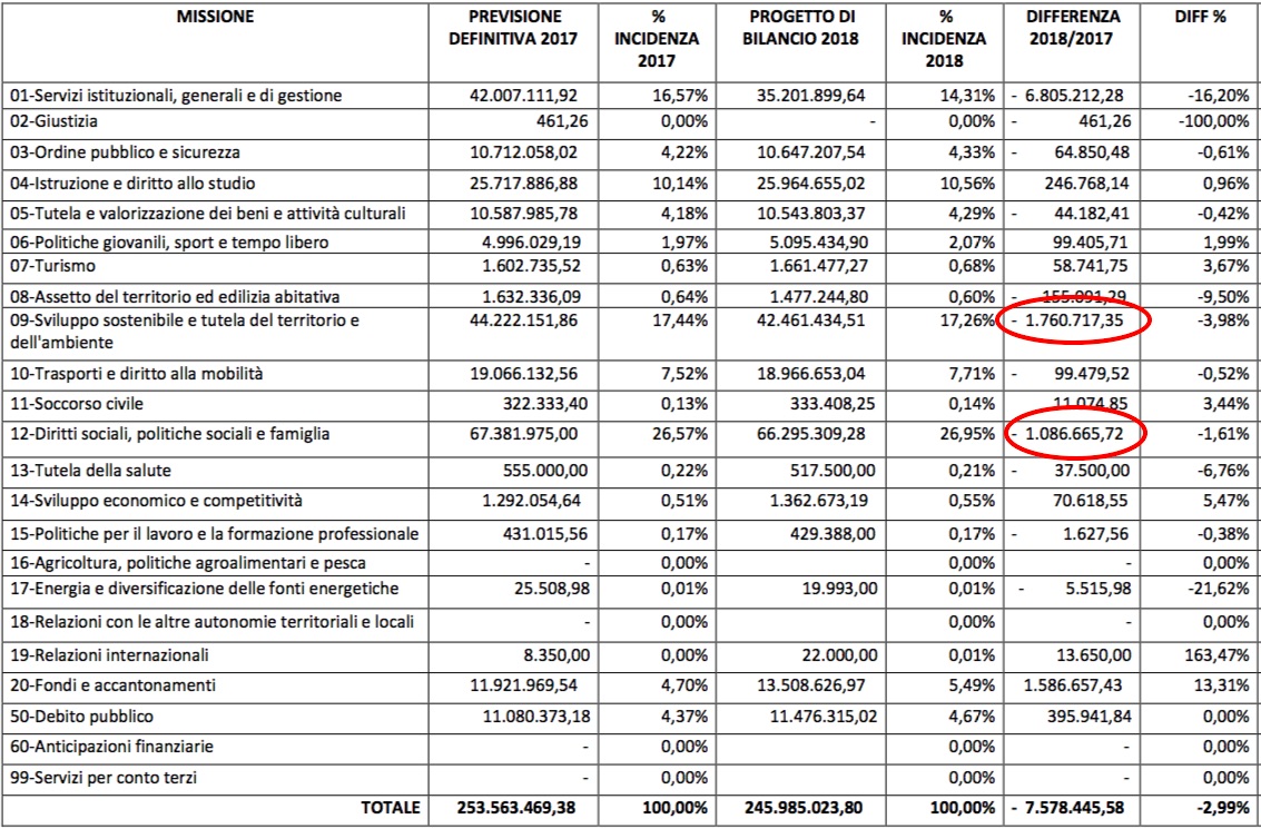 Oltre al capitolo “09 Sviluppo sostenibile e tutela del territorio e dell’ambiente”, che diminuisce di quasi 1,8 milioni rispetto al preconsuntivo 2017, ci preoccupa particolarmente il numero “12 Diritti sociali, politiche sociali e famiglia” che scende di 1 milione. Significa che è stato speso troppo nel 2017 oppure che i bisogni sono maggiori di quanto il bilancio prevede? Ripensando per esempio al capitolo disabili, viene da propendere per la seconda opzione: il Comune parte perciò con una previsione inferiore alle reali necessità. Temiamo che qui si inseriranno i discorsi sulla cosiddetta “equità”, che chiedono agli utenti dei servizi di pagare il conto.