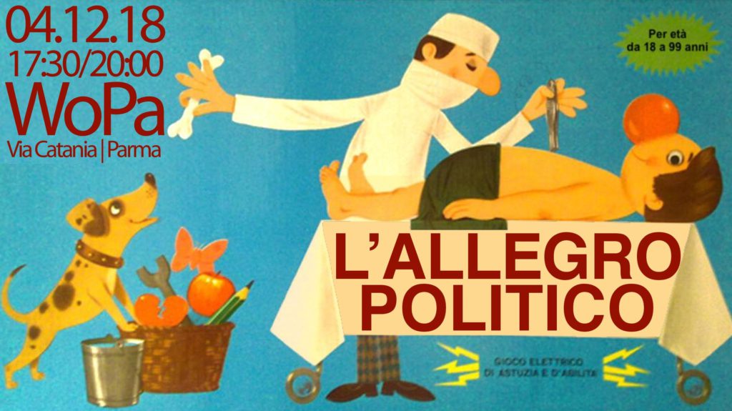 L’incontro sui generis viene promosso dal gruppo consiliare Effetto Parma che ha scelto di mettersi sotto esame e titolare l’evento “L’allegro Politico”. Perché? Beh, “la politica è una cosa sporca” spiega la locandina. Partendo da questa asserzione, oramai generalizzata e che porta il crescendo di disaffezione generale alla politica, si cercherà di invertire la rotta con l’aiuto dell’esperto pedagogo Mantegazza, indagando sull’attività quotidiana di alcuni protagonisti provenienti dalle amministrazioni locali di Parma e Provincia. Senza sconti o volontà celebrative.