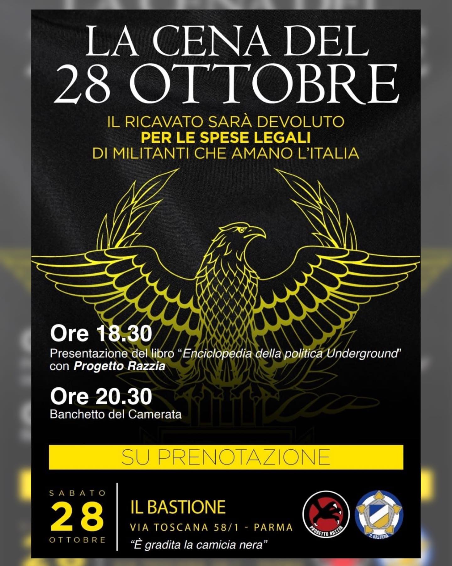 Parma, Medaglia d’oro per la Lotta di liberazione e la Resistenza non può accettare che il prossimo 28 ottobre si svolga un raduno di “camerati” in “camicia nera” , di chiaro stampo fascista, e oltretutto a sostegno di militanti neofascisti. Già nei giorni scorsi erano comparsi manifesti abusivi di contenuto razzista affissi da gruppi di estrema destra: con questo raduno è evidente la volontà di promuovere l’ideologia fascista, potendo peraltro contare, purtroppo, anche su atteggiamenti di legittimazione da parte della destra istituzionale parmigiana.