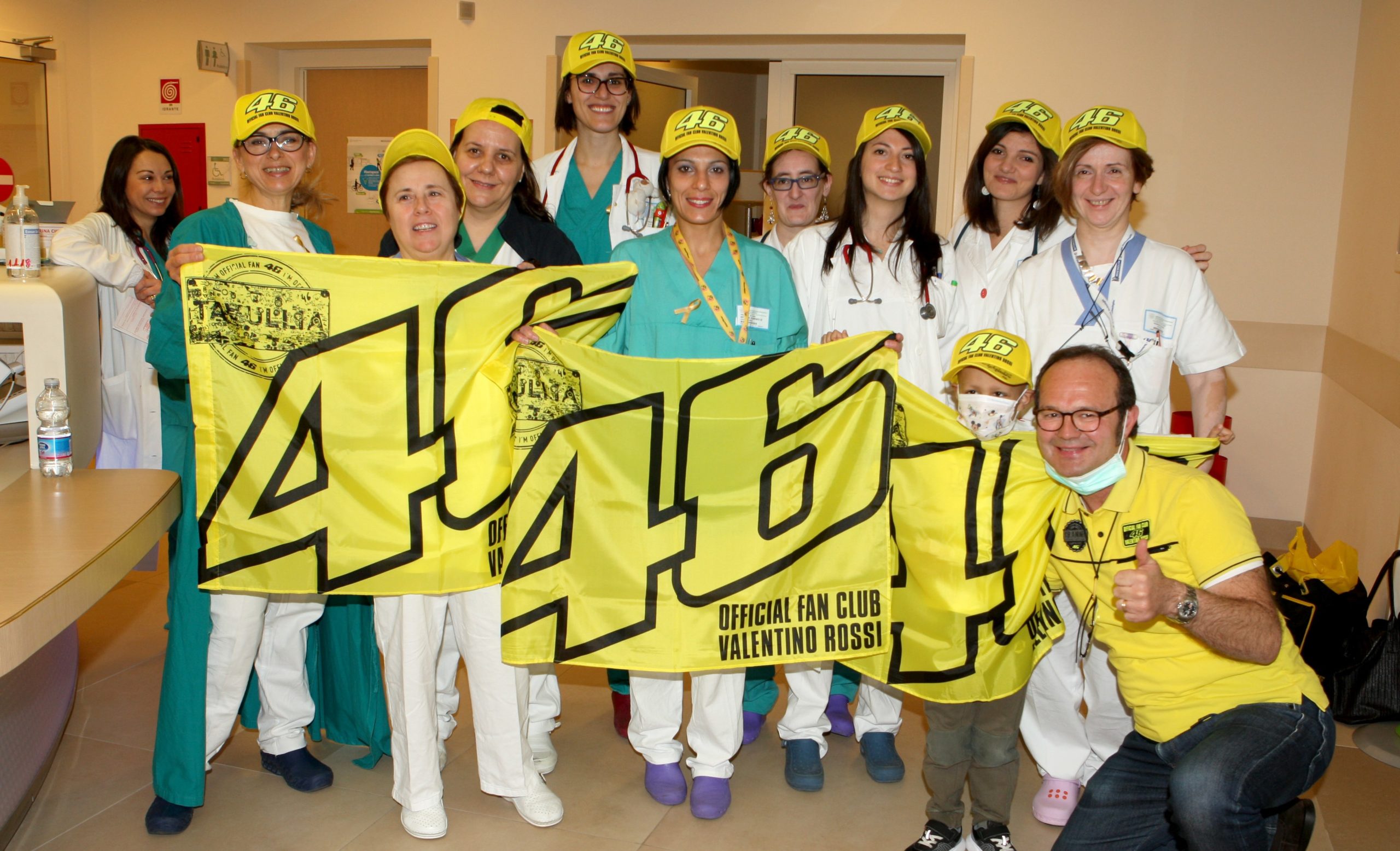 Zainetti e bandiere per tutti, ogni bambino che spunta da una porta riceve una parola e un gadget. E Flavio, anima storica del Fan Club del “Dottor Rossi”, veste di giallo anche il personale che partecipa alla colorata distribuzione. Senza dimenticare nessuno: dal reparto di Pediatria e Oncoematologia della dottoressa Patrizia Bertolini, al terzo piano della Pediatria generale e d’urgenza del dottor Icilio Dodi, agli ambulatori e al day hospital per chiudere al piano terra con il Pronto Soccorso per bambini e adolescenti. “L’anno scorso – spiega il presidente – abbiamo visitato trenta ospedali pediatrici, da Trento a Palermo. E ci chiamano anche dall’estero. Cercheremo di portare Valentino Rossi ovunque perché non c’è niente di più bello del sorriso di un bambino quando vede il 46, noi gli diamo una maglietta o una bandiera ma è come se consegnassimo una piccola goccia di energia”.
