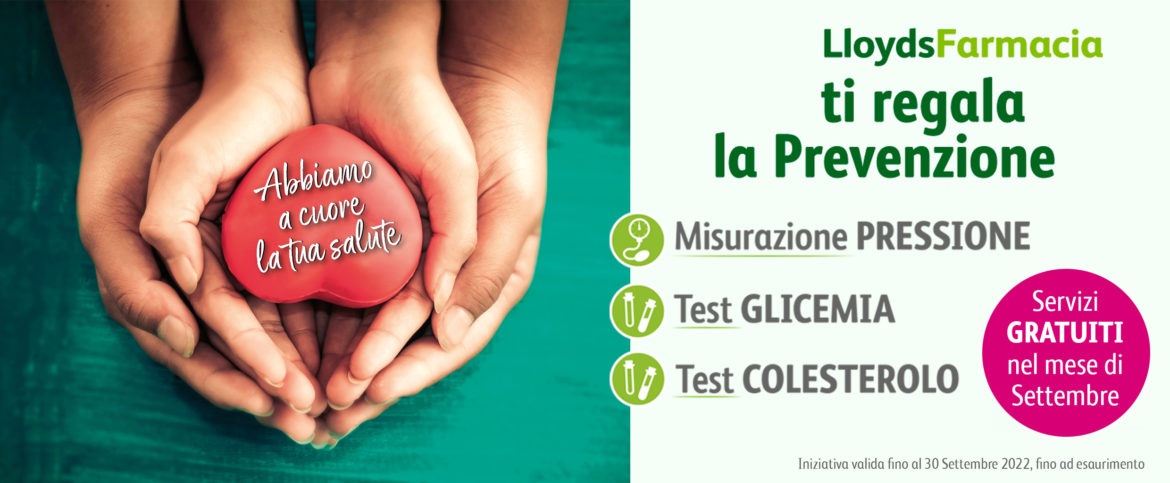 Nelle 3 LloydsFarmacia di Parma, per tutto settembre, un nuovo mese di prevenzione con test gratuiti per tutta la popolazione, su Glicemia, Pressione e Colesterolo. Grazie all’alta adesione della cittadinanza – che nello scorso mese di aprile ha registrato un totale di oltre 15.000 test effettuati a livello nazionale – si replica l’iniziativa che dedica un intero mese alla prevenzione in farmacia. È consigliabile accedere ai test su prenotazione, da effettuare tramite App Lloyds – sezione Servizi – o contattando direttamente il numero unico 02/80011022, attivo dalle 8.00 alle 20.00 (elenco delle 158 LloydsFarmacia a livello nazionale aderenti all’iniziativa: https://issuu.com/admentaitalia/docs/farmacie_salute_e_prevenzione?fr=sMGI3NzE2NDY).