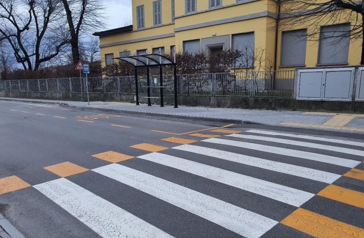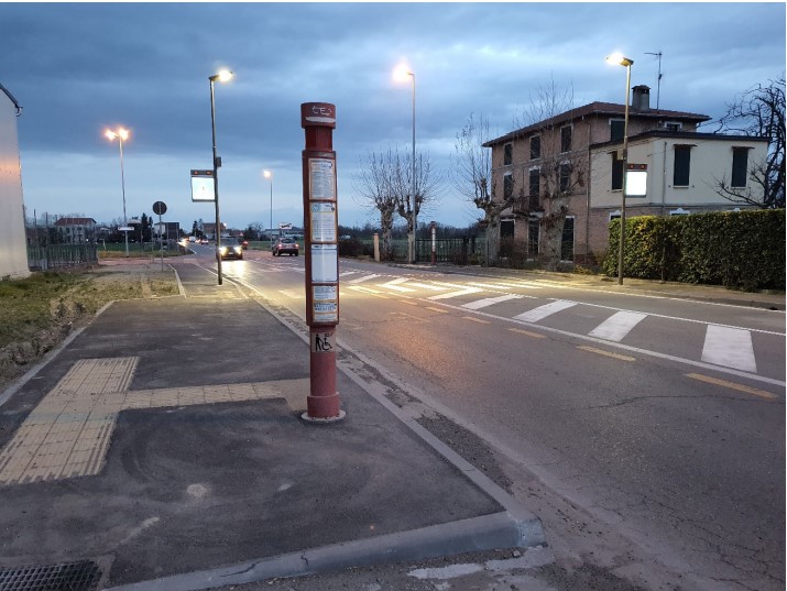 A Baganzola, prima della riqualificazione, le due fermate erano collocate sulla banchina erbosa, prossime alla barriera di sicurezza e senza alcun collegamento pedonale. L’intervento le ha ricollocate in posizione idonea, realizzando anche nuove piazzole rialzate con pavimentazioni tattili per non vedenti e collegandole tra loro con un nuovo passaggio pedonale dotato di un efficace sistema di illuminazione con lampeggianti.
