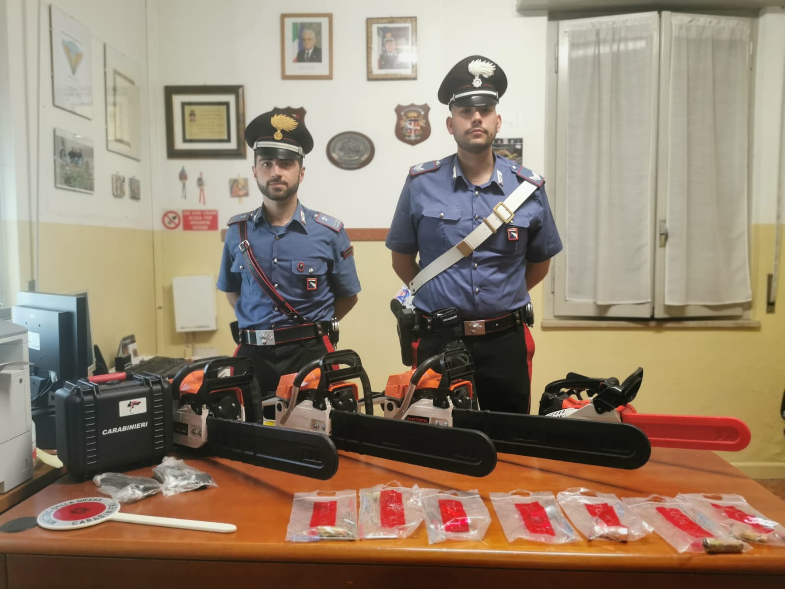 Durante il controllo i carabinieri hanno trovato nel bagagliaio quattro motoseghe con motore a scoppio alimentato a benzina ed i relativi kit di smontaggio, tutte e quattro uguali, ma riportanti nomi e marchi differenti su ognuna di esse. I due non erano in possesso di alcun documento di trasporto, scontrino o fattura d’acquisto, e non era nemmeno autorizzati alla vendita al dettaglio o all’ingrosso.