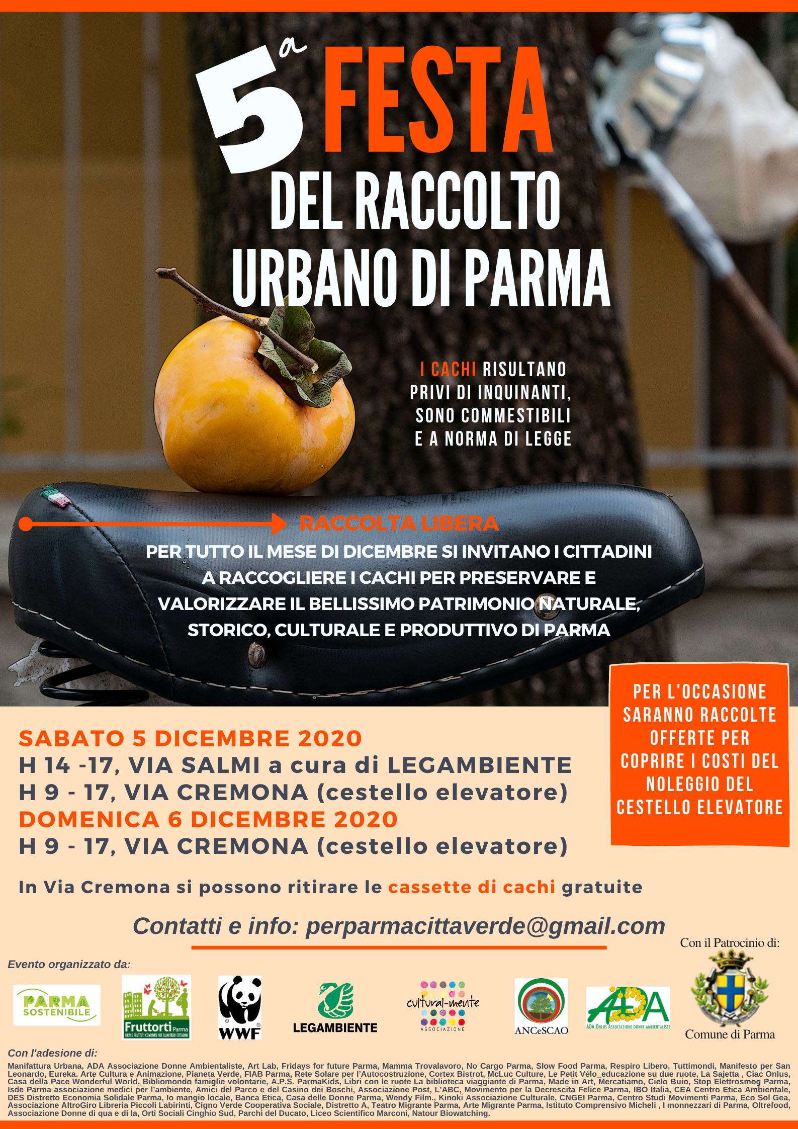 Torna sabato 5 dicembre “La Festa del Raccolto Urbano”. L’iniziativa, giunta alla sua quinta edizione, per motivi legati all’emergenza Covid 19, si terrà, quest’anno, con modalità differenti rispetto al passato per evitare assembramenti e situazioni che siano in contrato con le norme anticontagio.  Lo spirito dell’iniziativa è quello di celebrare il patrimonio culturale, naturale e produttivo rappresentato dalle alberature frutticole presenti nell’area urbana di Parma. Si tratta, in questa stagione, di 142 alberi di cachi, dislocati in 7 vie cittadine. I cachi analizzati da un laboratorio certificato, risultano privi di inquinanti e sono pienamente a norma di legge.