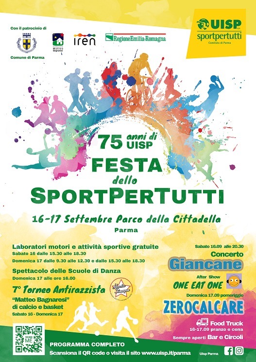 Organizzata dall’Unione Italiana Sport Per tutti (UISP) col patrocinio del Comune di Parma, la Festa dello SportPerTutti propone un ricco calendario di eventi che coinvolge trenta associazioni e società sportive, decine di tecnici educatori, istruttori e istruttrici, ballerine e ballerini e artisti dello sport, per portare chiunque lo desideri a provare le discipline sportive presenti in modo totalmente gratuito. Laboratori motori e attività sportive, tornei, spettacoli, concerti per una weekend di sport e di festa.