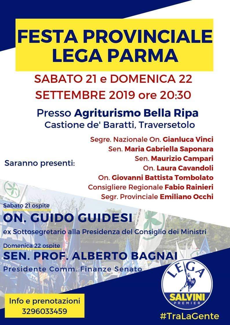 Festa provinciale della Lega a Traversetolo di UG 15 Settembre 2019 15 Settembre 2019 21 Sabato 21 e domenica 22 settembre si terrà a Traversetolo la Festa provinciale della Lega Parma. Gli ospiti nazionali saranno i parlamentari Guido Guidesi e il Presidente della Commissione Finanze del Senato Alberto Bagnai.