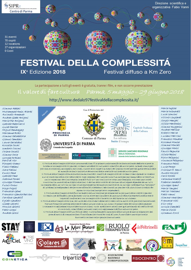 Il Festival della Complessità è un festival libero, autofinanziato e non ha scopo di lucro; a Parma ospiterà quest’anno 31 eventi con 70 ospiti aggregando il lavoro di 27 organizzazioni.