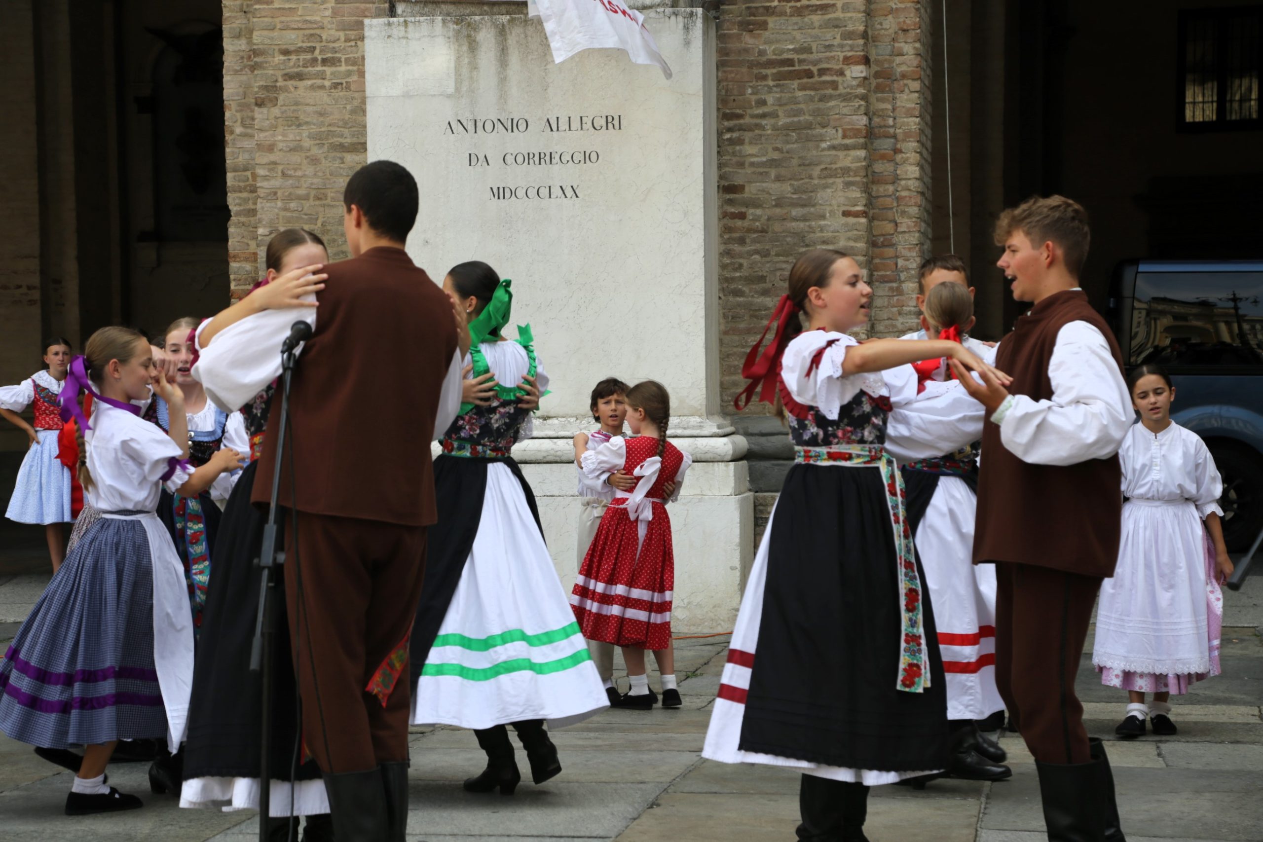 Il Presidente del Consiglio Comunale Michele Alinovi e l’Assessora alla Partecipazione, Associazionismo e Quartieri, con delega alla Pace, Daria Jacopozzi hanno accolto, nella Sala del Consiglio Comunale, il gruppo Children’s folk dance ensemble Turiec dalla Slovacchia e il gruppo The folk ensemble Děcka z Buchlovic dalla Repubblica Ceca, in Italia per il Festival Internazionale dei Giovani 2025. Si tratta della terza tappa parmigiana del progetto, patrocinato dall’UNESCO, che da anni si svolge sui nostri Appennini nel periodo estivo, coordinato da Carlo Devoti. Successivamente i ragazzi e le ragazze si sono esibiti in Piazza Garibaldi.