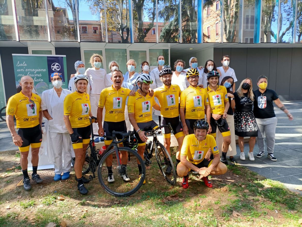 Il presidente Matteo Marzotto, insieme al testimonial di FFC Ricerca Edoardo Hensemberger e agli amici e campioni sportivi Jury Chechi, Davide Cassani, Iader Fabbri, Max Lelli, Fabrizio Macchi e Alessandra Sensini in sella alle loro bici hanno incontrato i medici, gli infermieri e i pazienti del Centro dell’Ospedale di Parma.