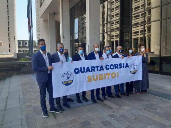 Flash-mob del gruppo Lega Emilia-Romagna, questa mattina sotto alla sede dell’Assemblea legislativa della Regione, per rivendicare la realizzazione della quarta corsia A1 fra Modena (interconnessione con A22) e il confine regionale a Piacenza.