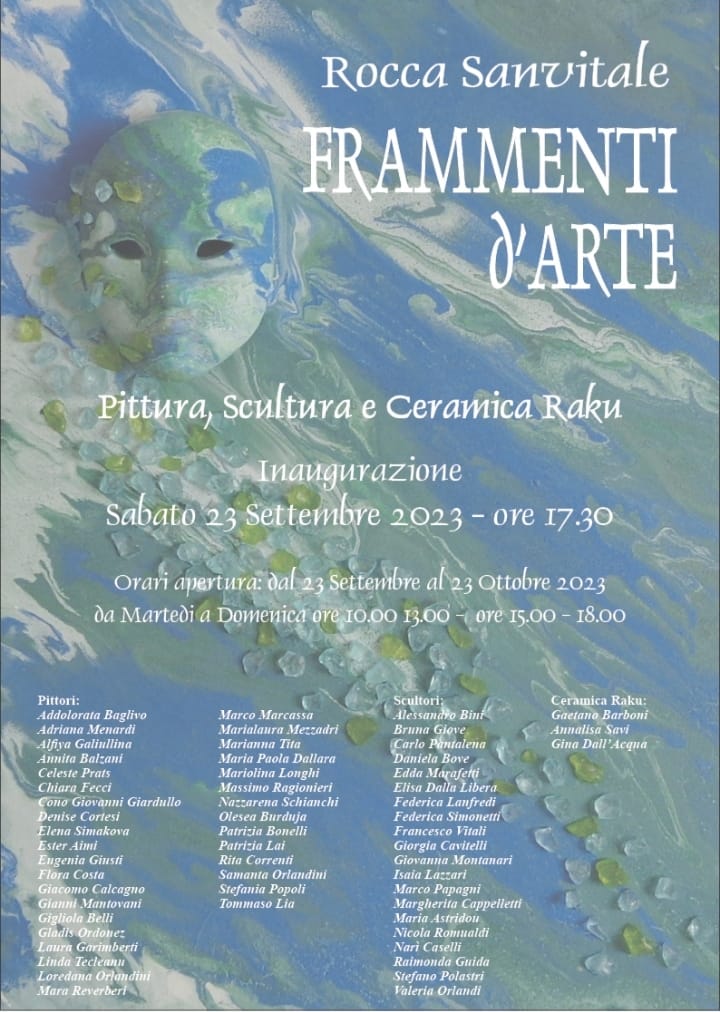 Frammenti d’arte, si diceva, ma anche pittura, scultura e ceramica raku: il coordinatore artistico, Tommaso Lia, e i pittori Flora Costa e Gianni Mantovani sono stati in grado di riunire svariate espressività, tecniche diverse, multiformi talenti creativi in una sorta di tensione che sempre ci accompagna verso l’opera d’arte totale; singolare e preziosa, poi, la presenza di nomi illustri a fianco di altri emergenti.