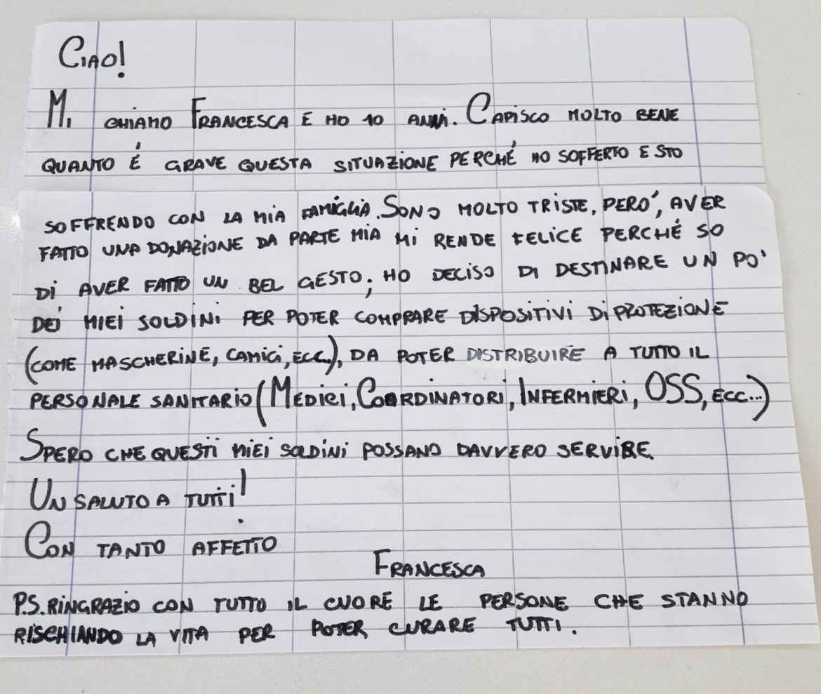 Mi chiamo Francesca e ho 10 anni. Inizia così la lettera in cui Francesca spiega perché ha deciso di destinare un po’ dei suoi “soldini” per comperare dispositivi di protezione da distribuire a tutto il personale sanitario dell’Ospedale Maggiore, in particolare per coloro impegnati nei reparti Covid-19. E li elenca tutti: medici, coordinatori, infermieri, oss eccetera. “Sono molto triste – aggiunge Francesca di 10 anni – però aver fatto una donazione mi rende felice perché so di aver fatto un bel gesto. Spero che questi soldini possano davvero servire”. E Francesca aggiunge un post scriptum prezioso: “ringrazio con tutto il cuore le persone che stanno rischiando la vita per poter curare tutti”.