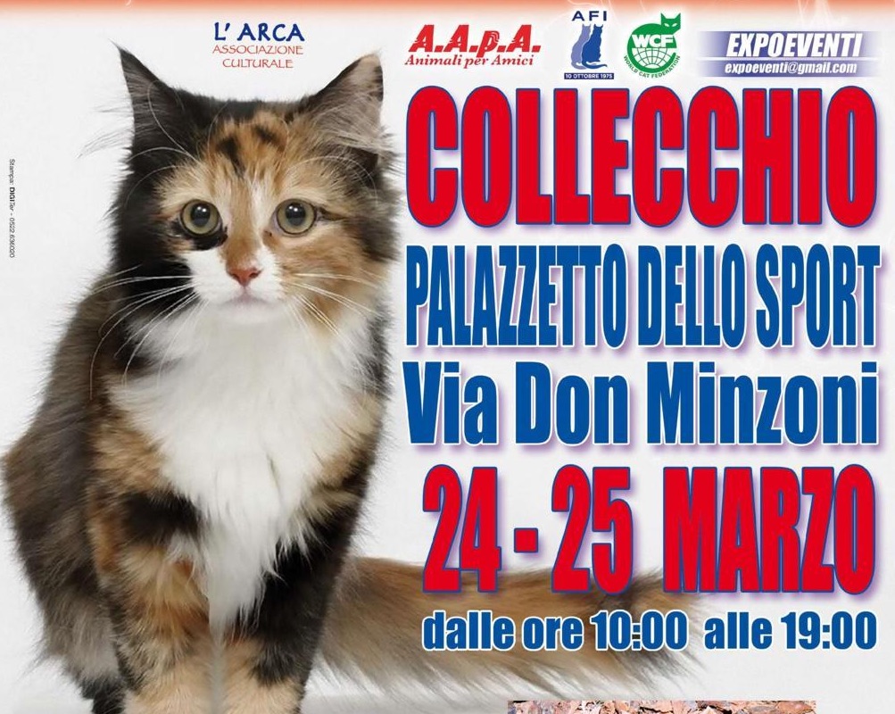 Se amate i gatti non potete mancare all’appuntamento di COLLECCHIO che si svolge presso il Palazzetto dello Sport in Via Don Giovanni Minzoni nei giorni di sabato 24 e domenica 25 Marzo 2018, orario dalle ore 10 alle ore 19, si svolgerà l’Esposizione Internazionale Felina WCF WORLD CAT FEDERATION “I GATTI PIU’ BELLI DEL MONDO” con la partecipazione di splendidi gatti di razza che, sotto l’egida dell’Associazione Felina Italiana verranno giudicati da Giudici Internazionali WCF nel Best in Show in programma al pomeriggio di entrambe le giornate.